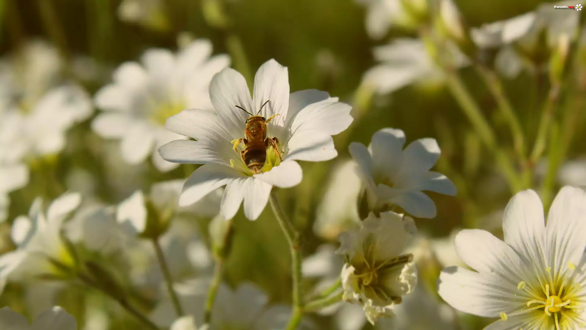 Białe, Kwiaty, Rogownica, Owad, Pszczoła, Zbliżenie - Zdjęcia