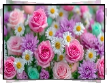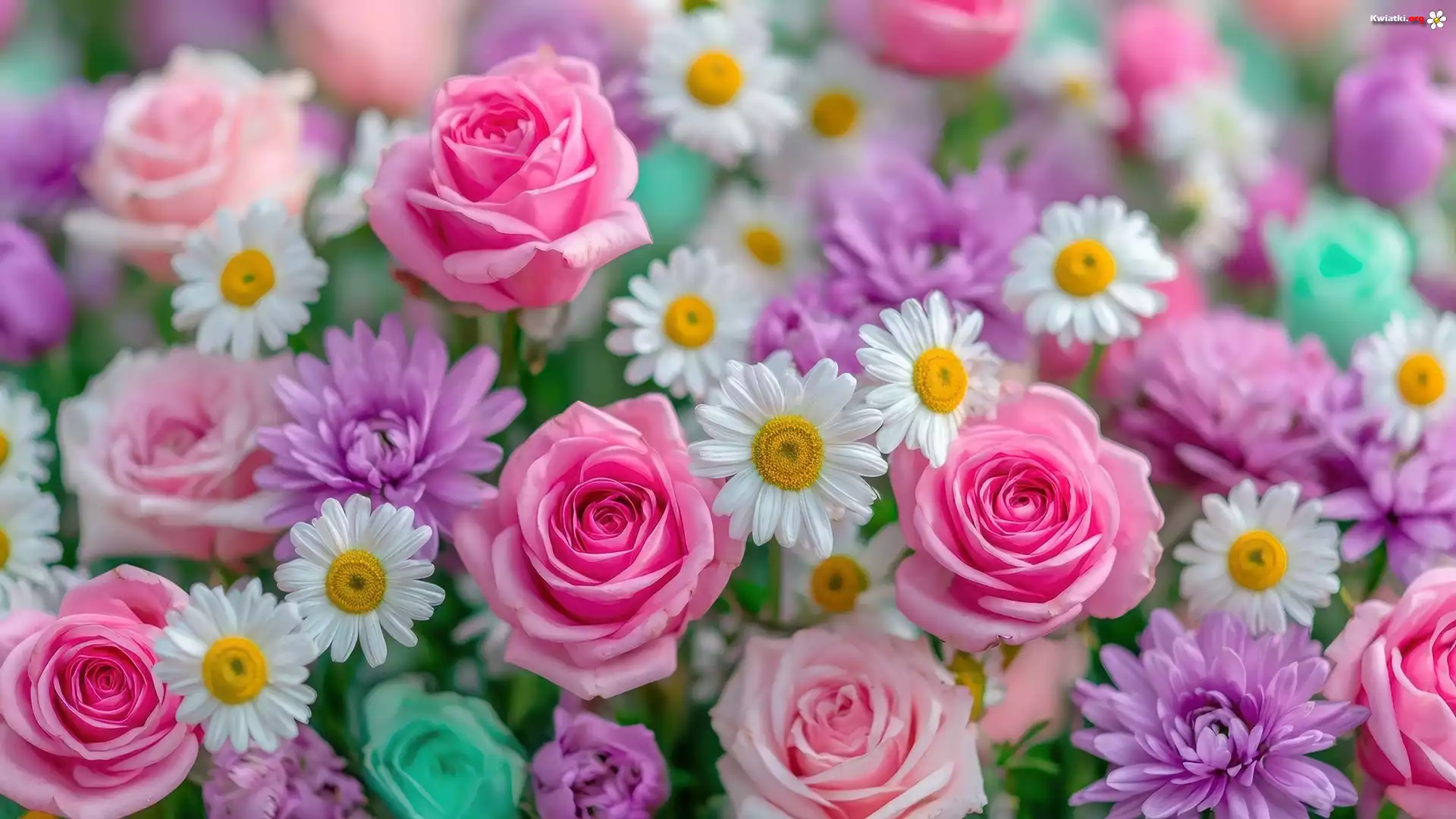 Kwiaty, Różowe, Róże, Białe, Stokrotki, Fioletowe, Astry - Zdjęcia