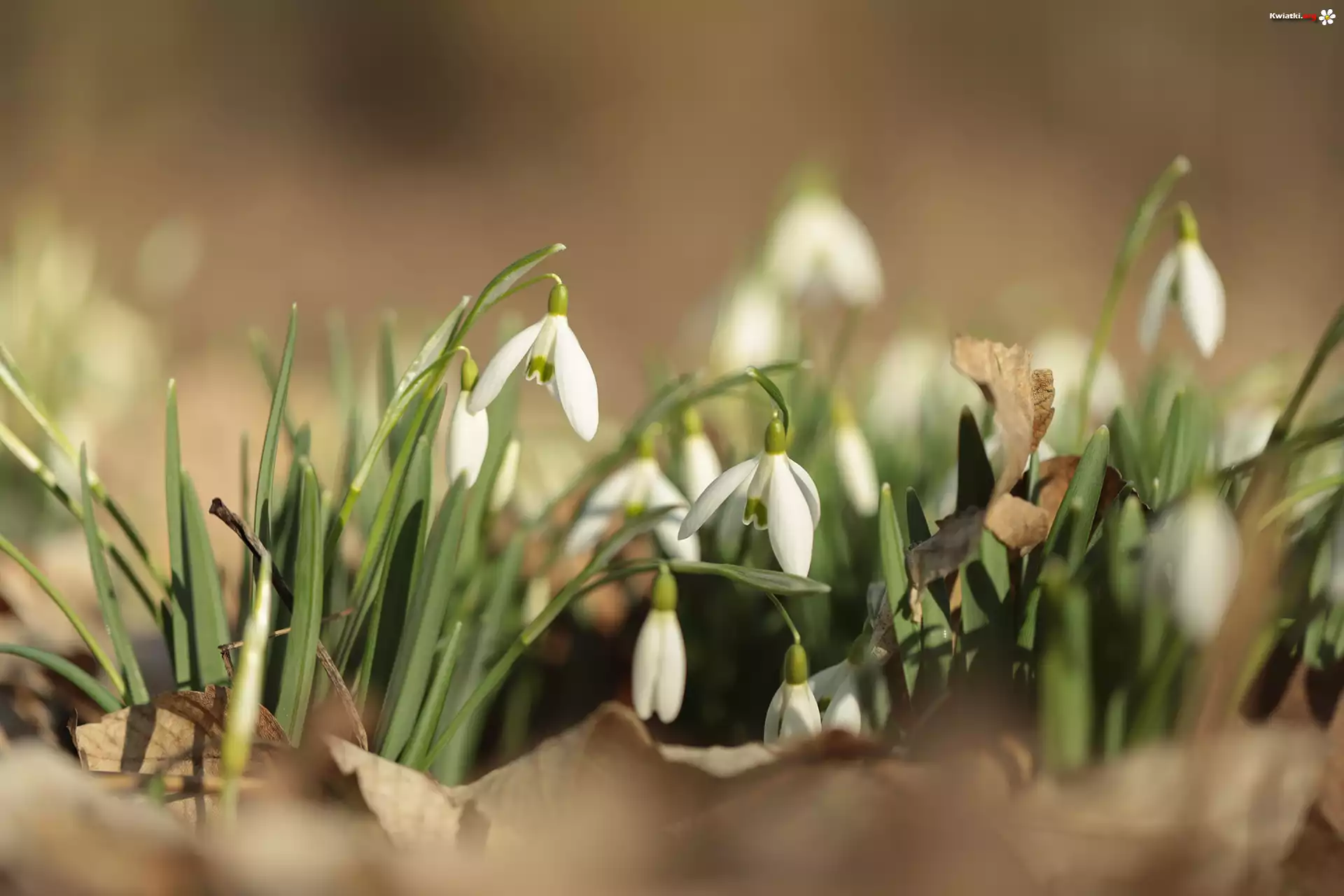 Białe, Przebiśniegi, Kwiaty, Rozmyte tło - Zdjęcia