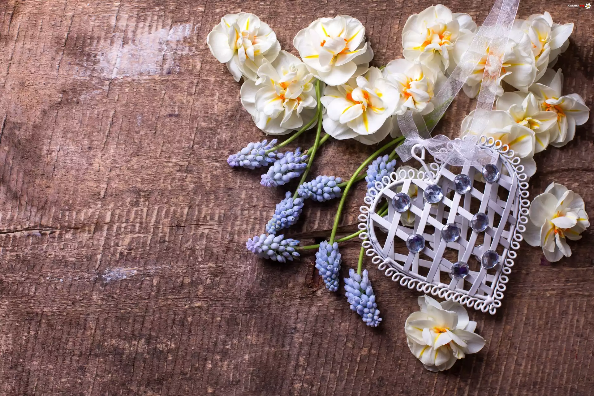 Kwiat Białe, Kwiatki, Szafirki, Serce, Wstążka