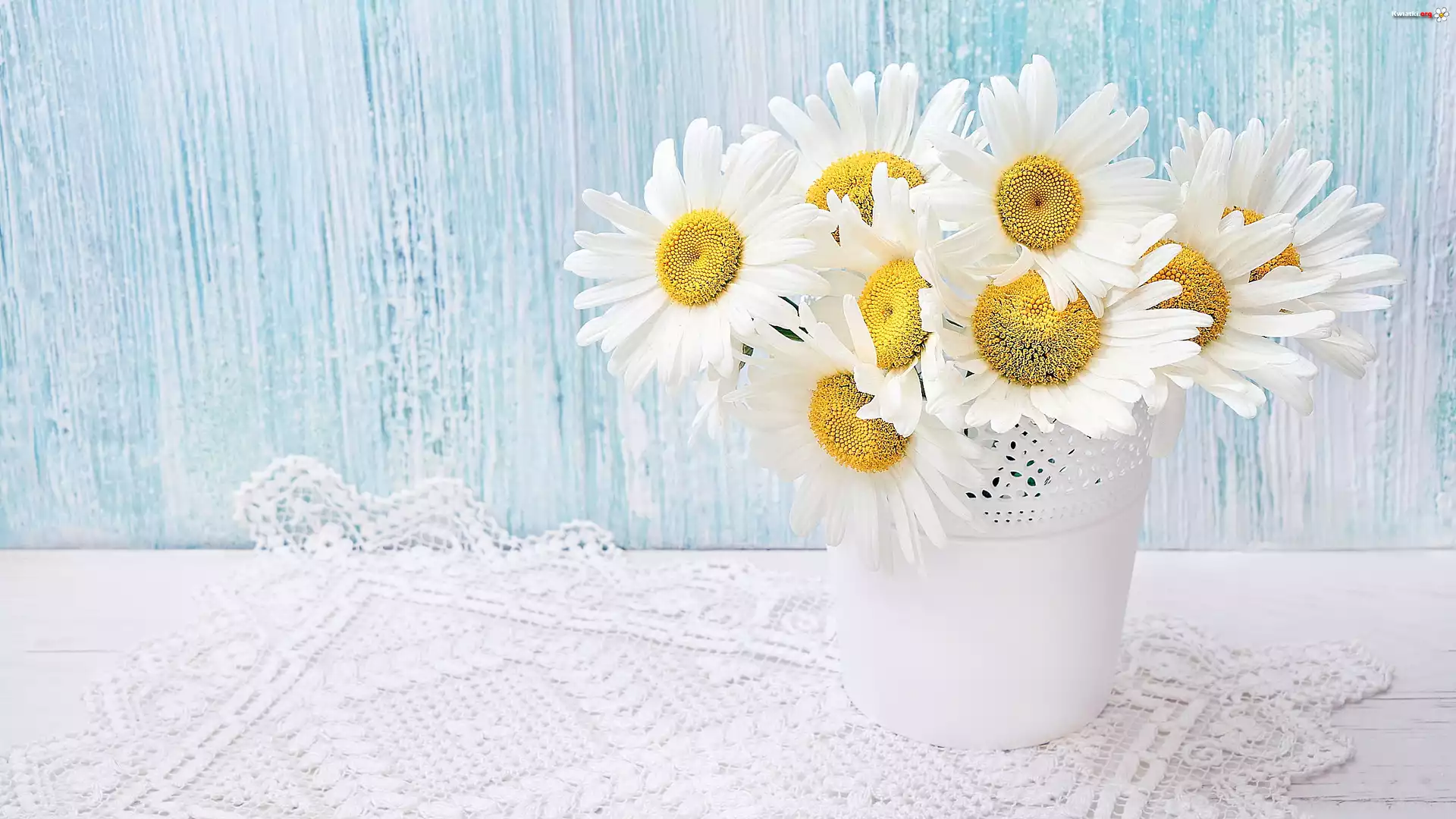 Białe, Margerytki, Doniczka, Serwetka, Drewno - Zdjęcia