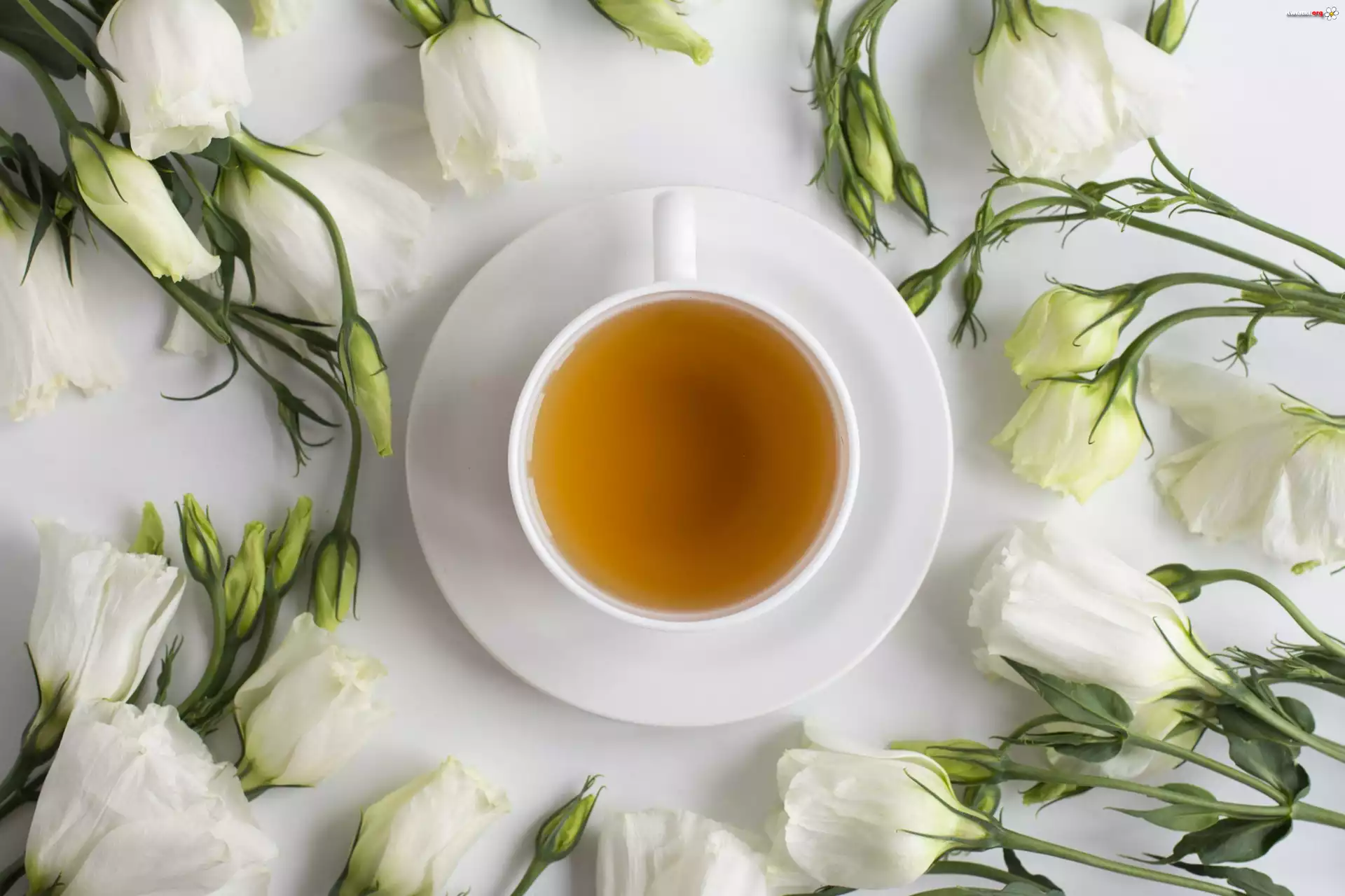 Białe, Kwiaty, Eustoma, Filiżanka, Spodek, Herbata - Zdjęcia