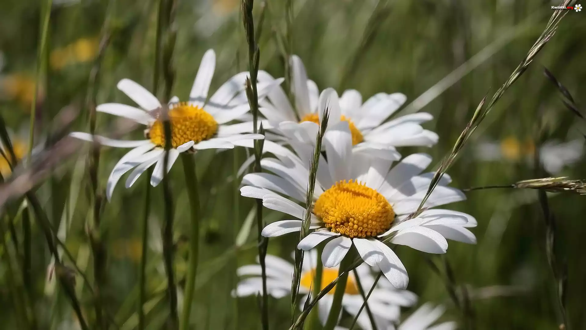 Kwiaty, Białe, Stokrotki, Trawa, Źdźbła - Zdjęcia
