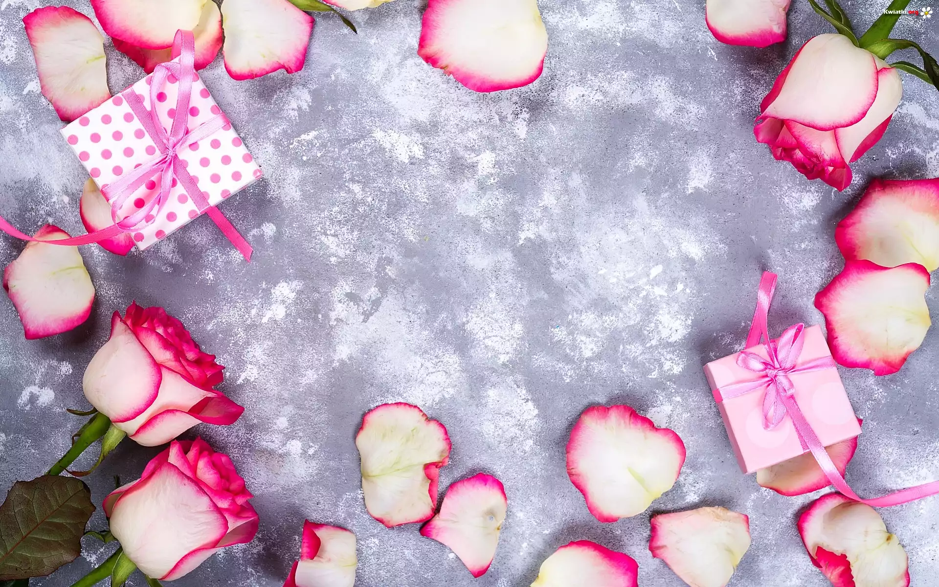 Różowo-białe, Róże, Płatki, Listki, Prezenty, Szare, Tło - Zdjęcia