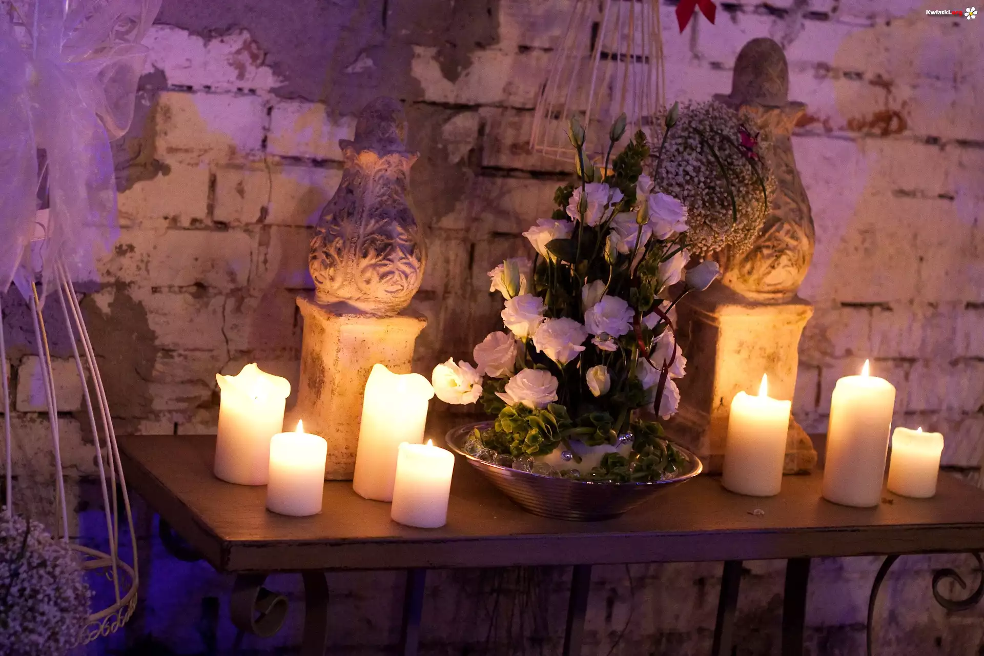 Kwiat Kompozycja, Białe, Świece, Stół, Kwiaty, Eustoma