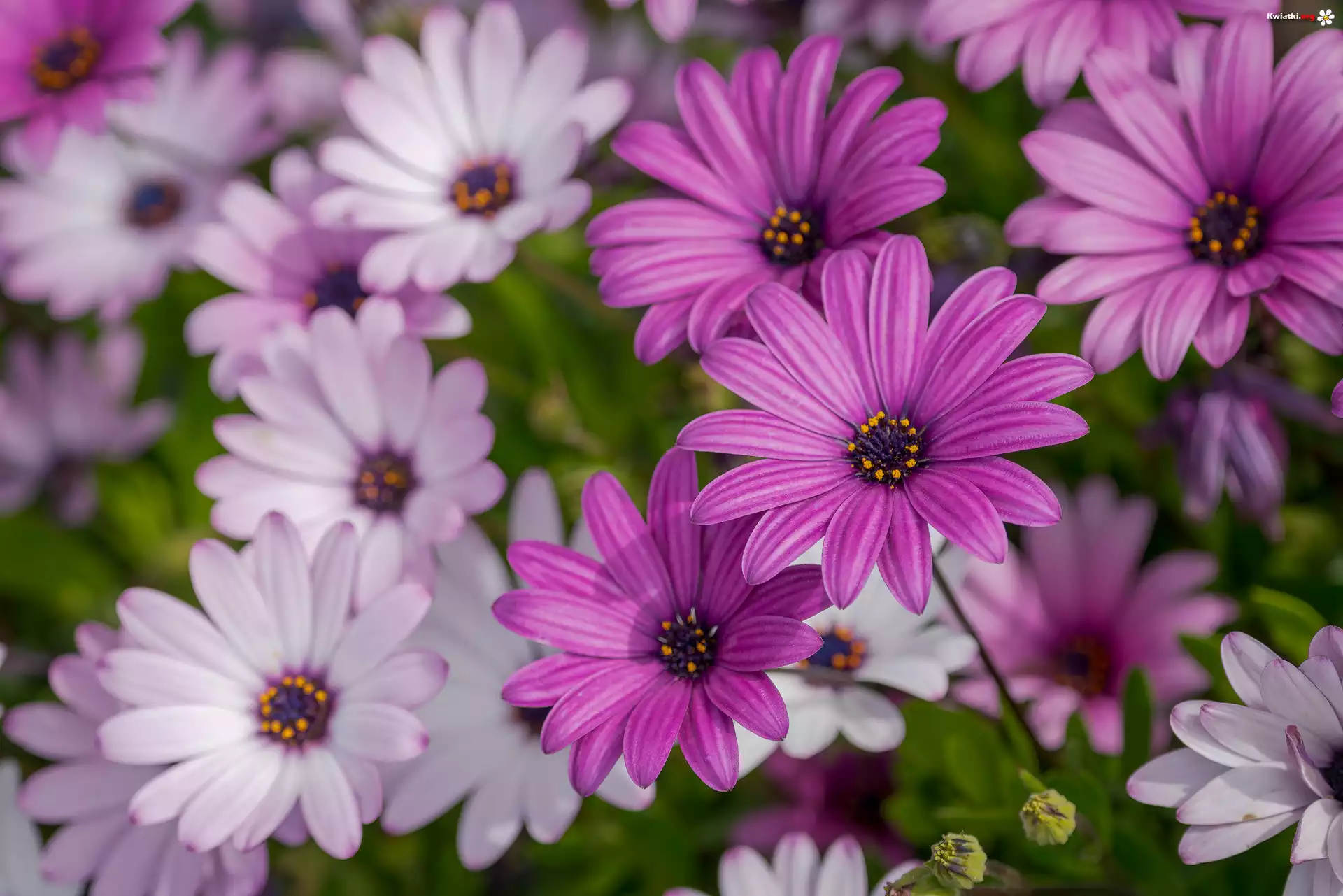 Kwiaty, Stokrotki afrykańskie, Białe, Fioletowe, Zbliżenie - Zdjęcia