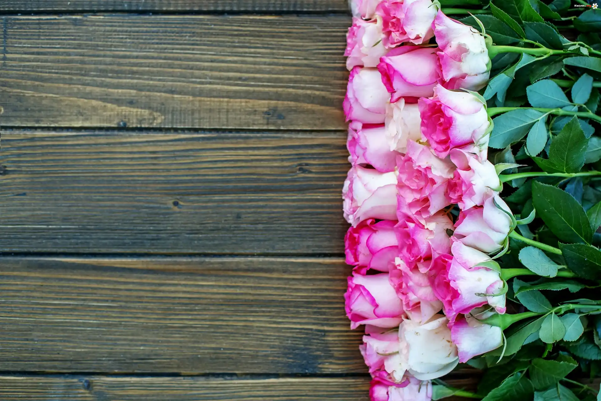 Biało-różowe, Róże, Listki, Deski - Zdjęcia