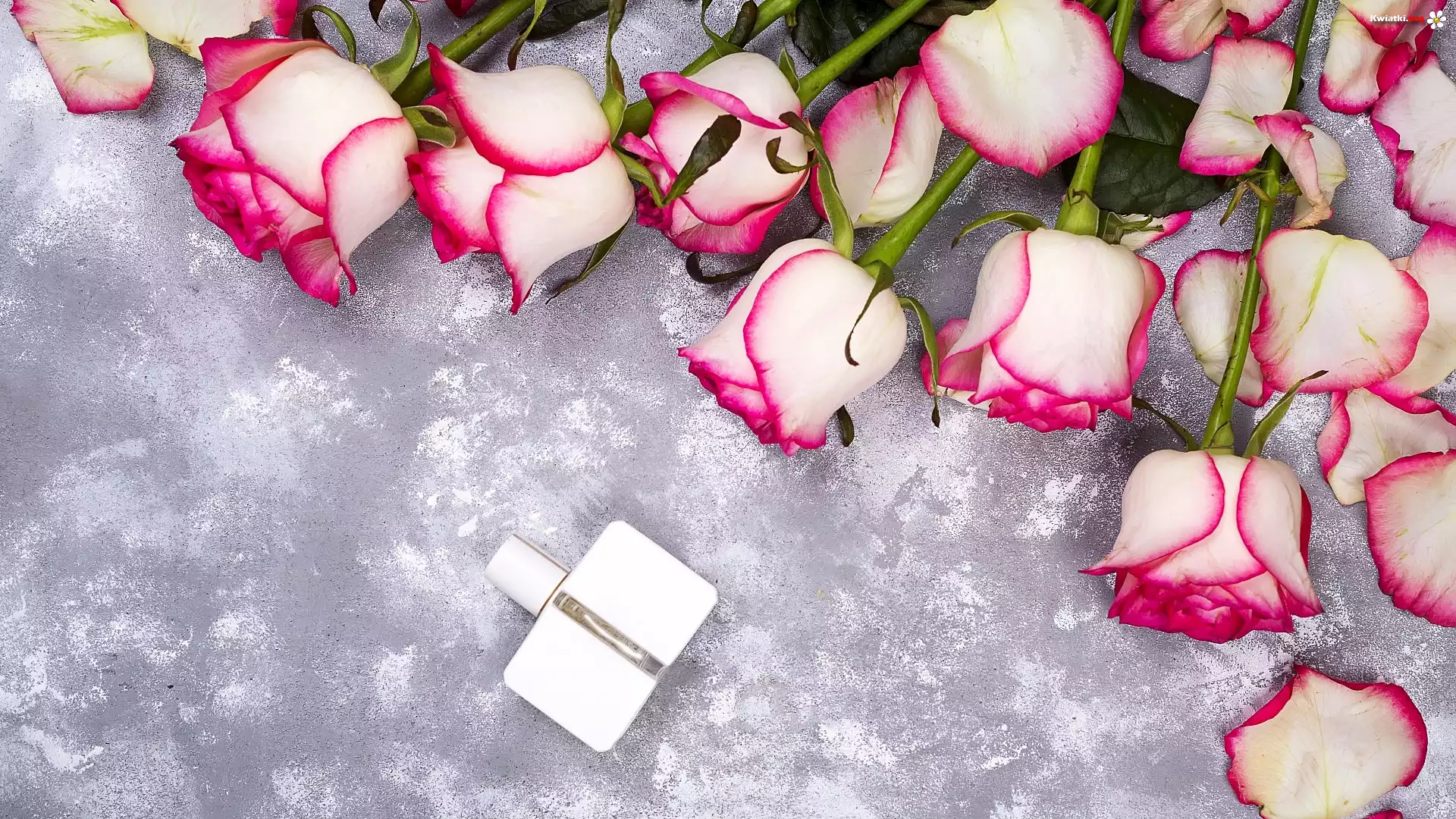 Kwiat Róże, Biało-różowe, Buteleczka, Perfumy, Szare, Tło