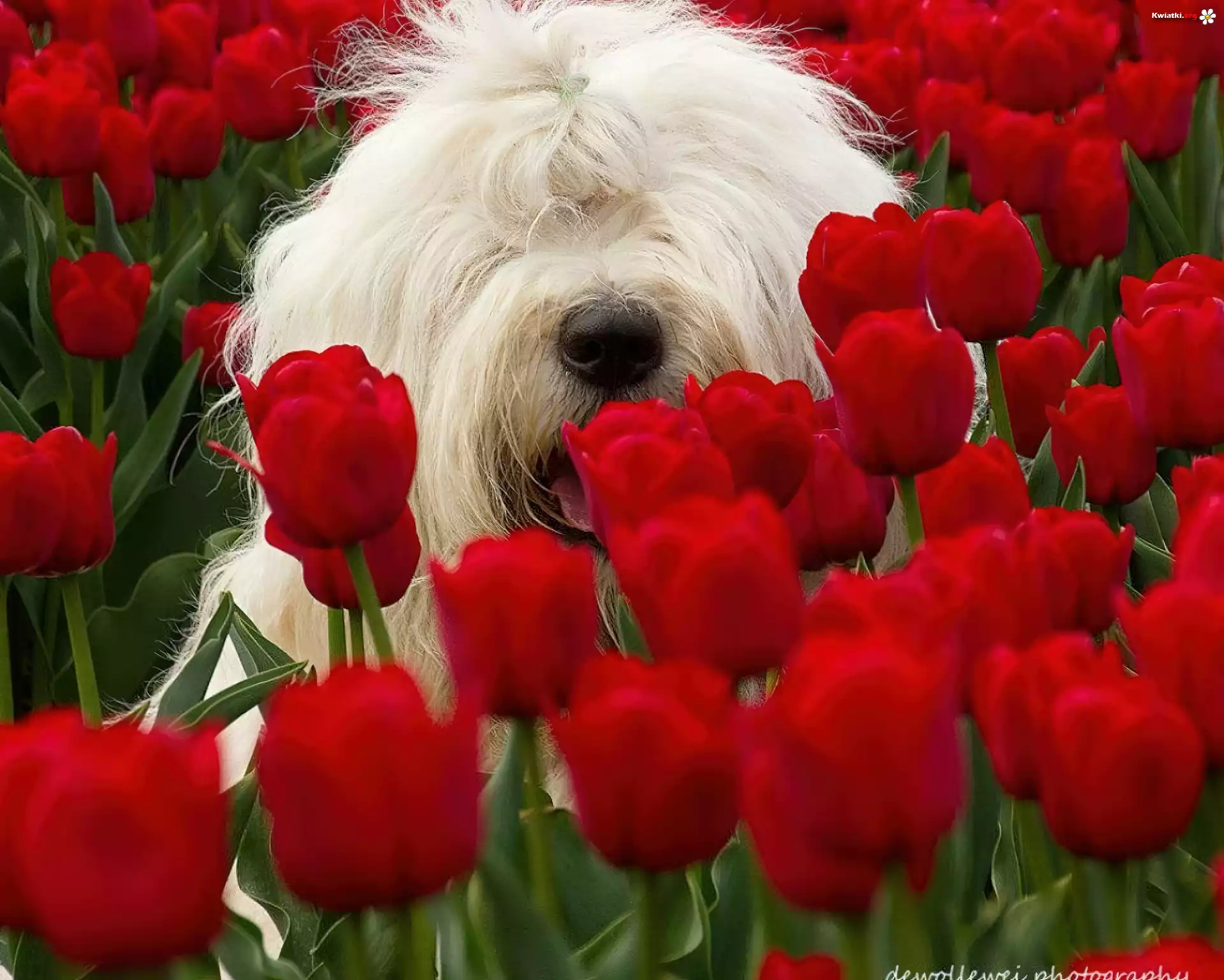 Biały, Pies, Czerwone, Tulipany, Maltańczyk - Zdjęcia