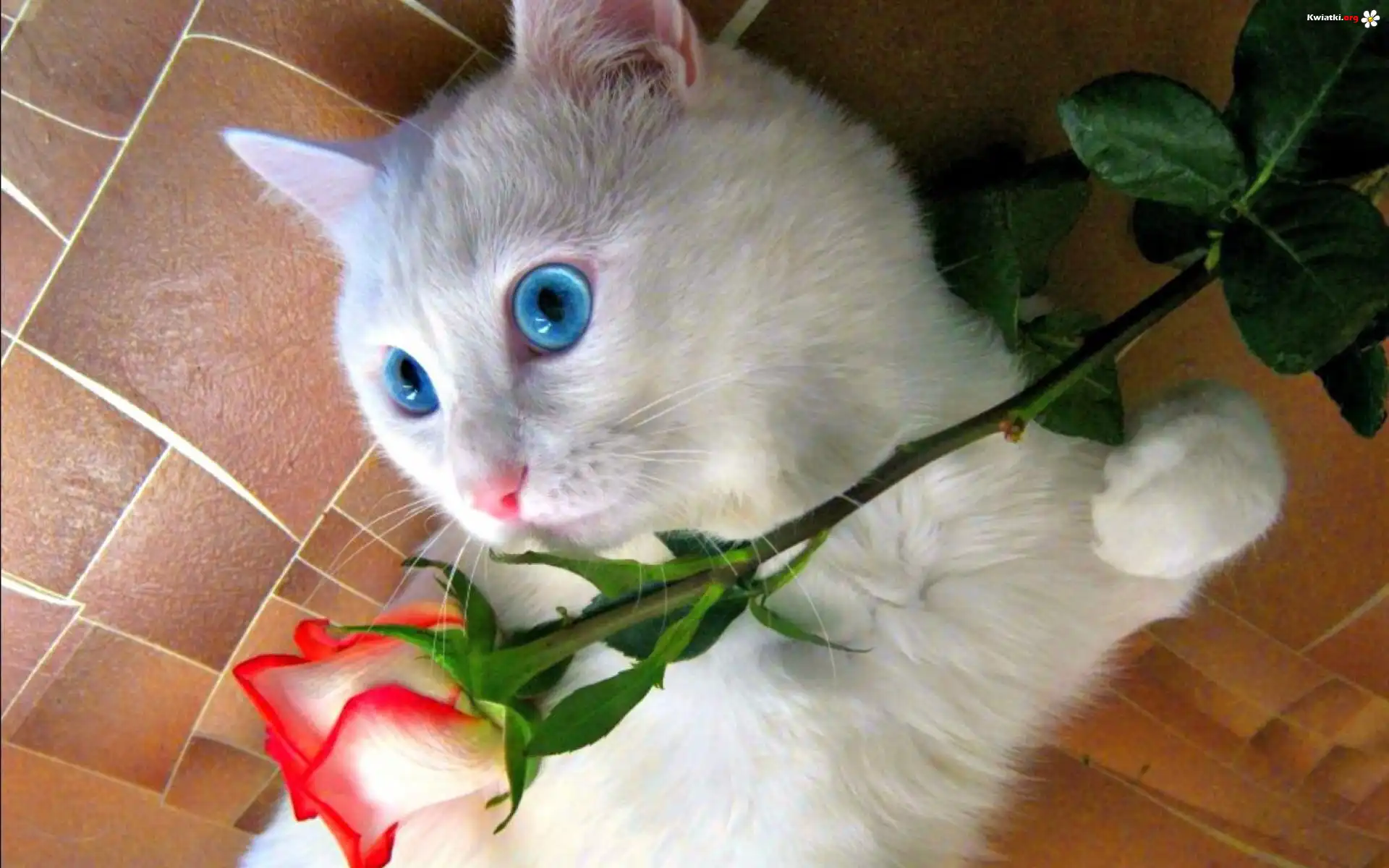 Biały, Kotek, Niebieskie, Oczy, Róża - Zdjęcia