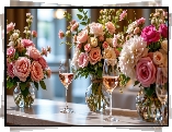 Róże, Bukiety, Kieliszki, Blat, Grafika AI - Zdjęcia