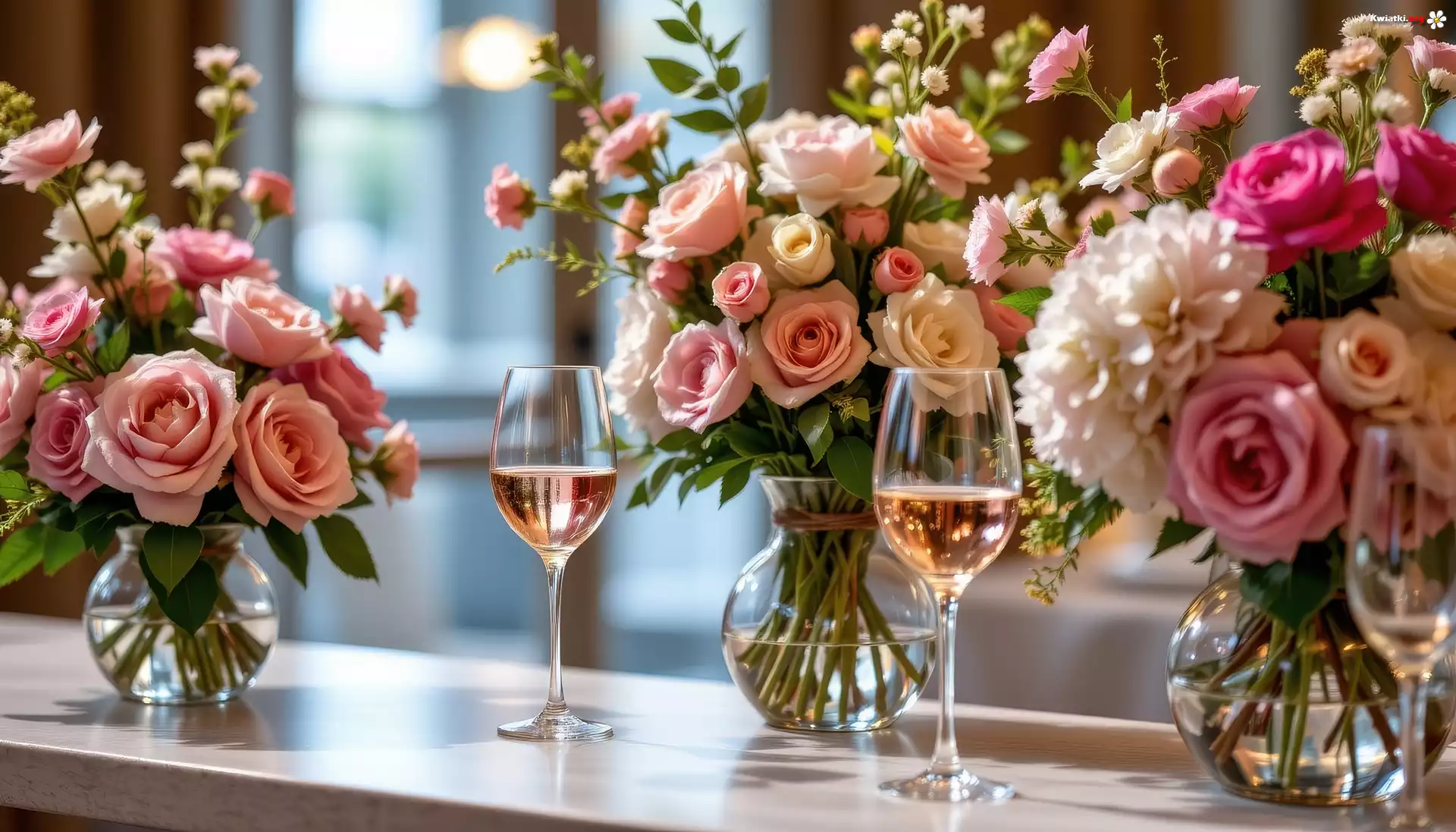 Kwiat Róże, Bukiety, Kieliszki, Blat, Grafika AI