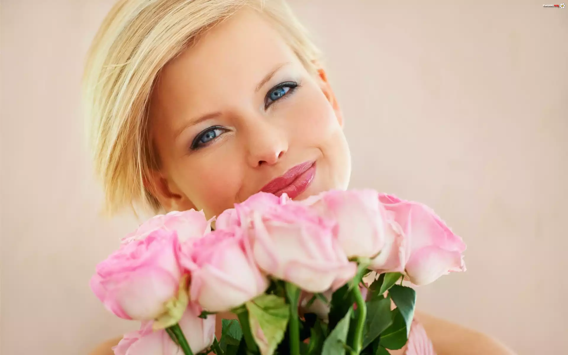 Blondynka, Uśmiech, Bukiet, Róż - Zdjęcia