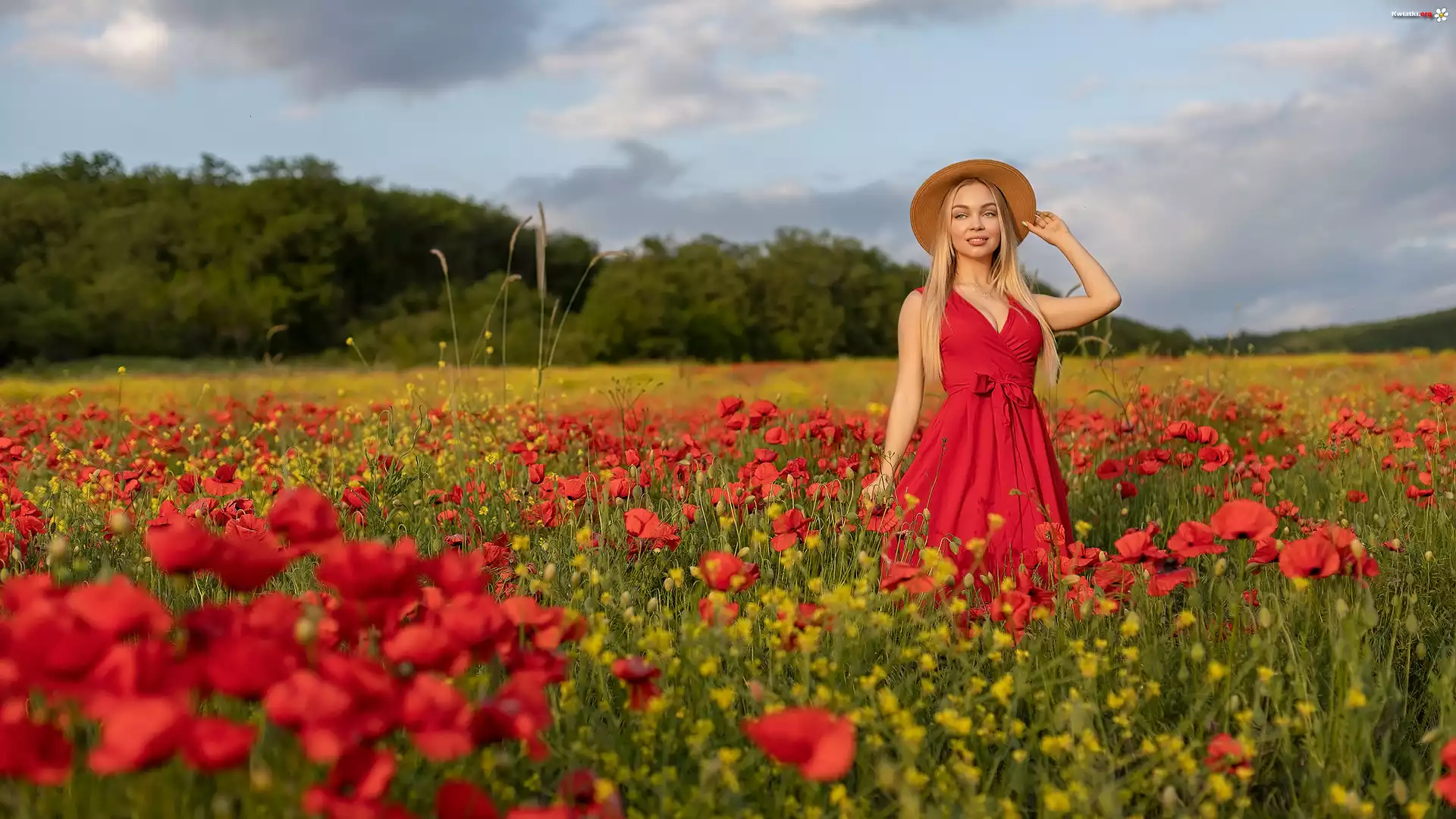Kobieta, Blondynka, Maki, Pole, Drzewa - Zdjęcia
