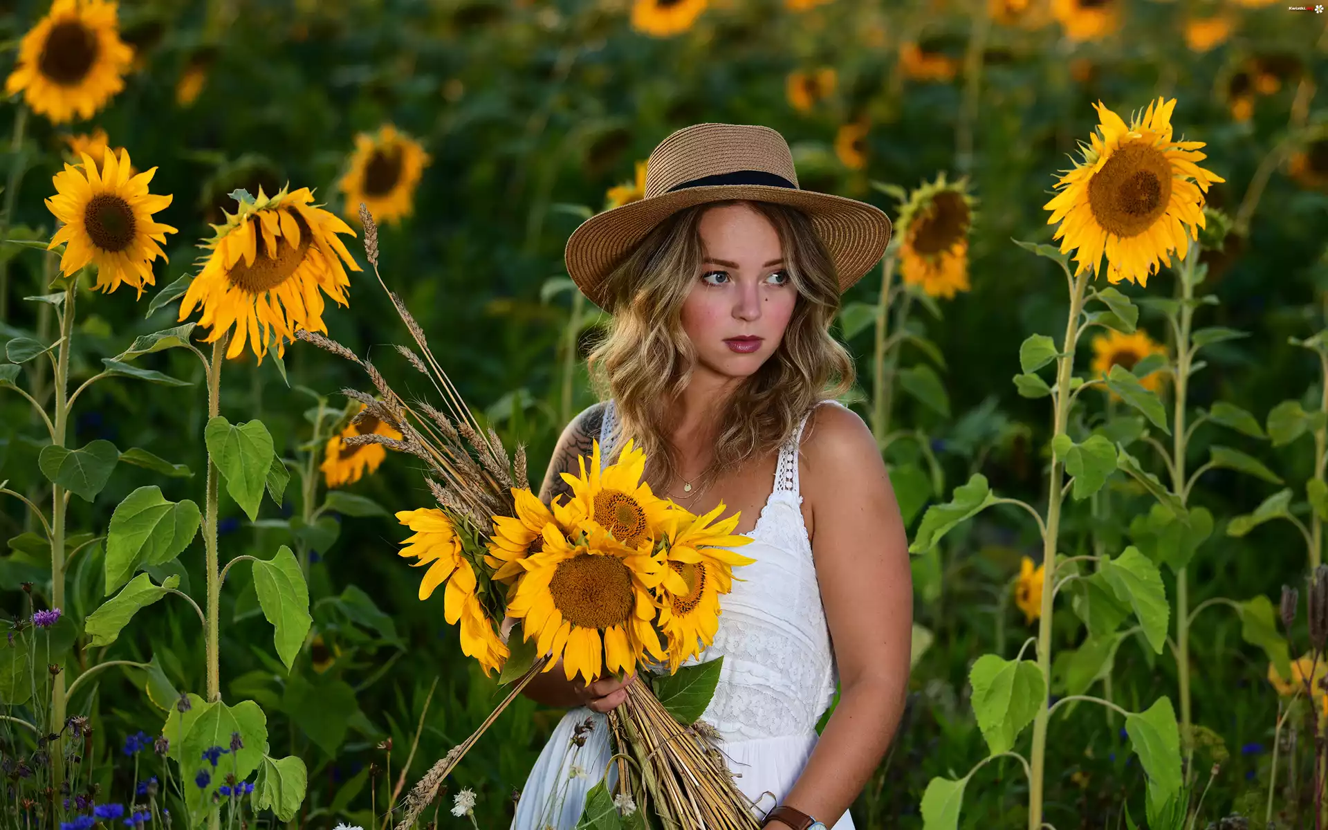 Kobieta, Blondynka, Kapelusz, Biała, Sukienka, Kwiaty, Bukiet, Słoneczniki - Zdjęcia