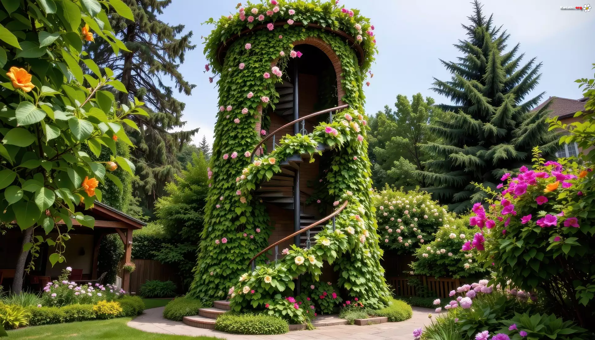 Ogród, Wieża, Kwiaty, Bluszcz - Zdjęcia