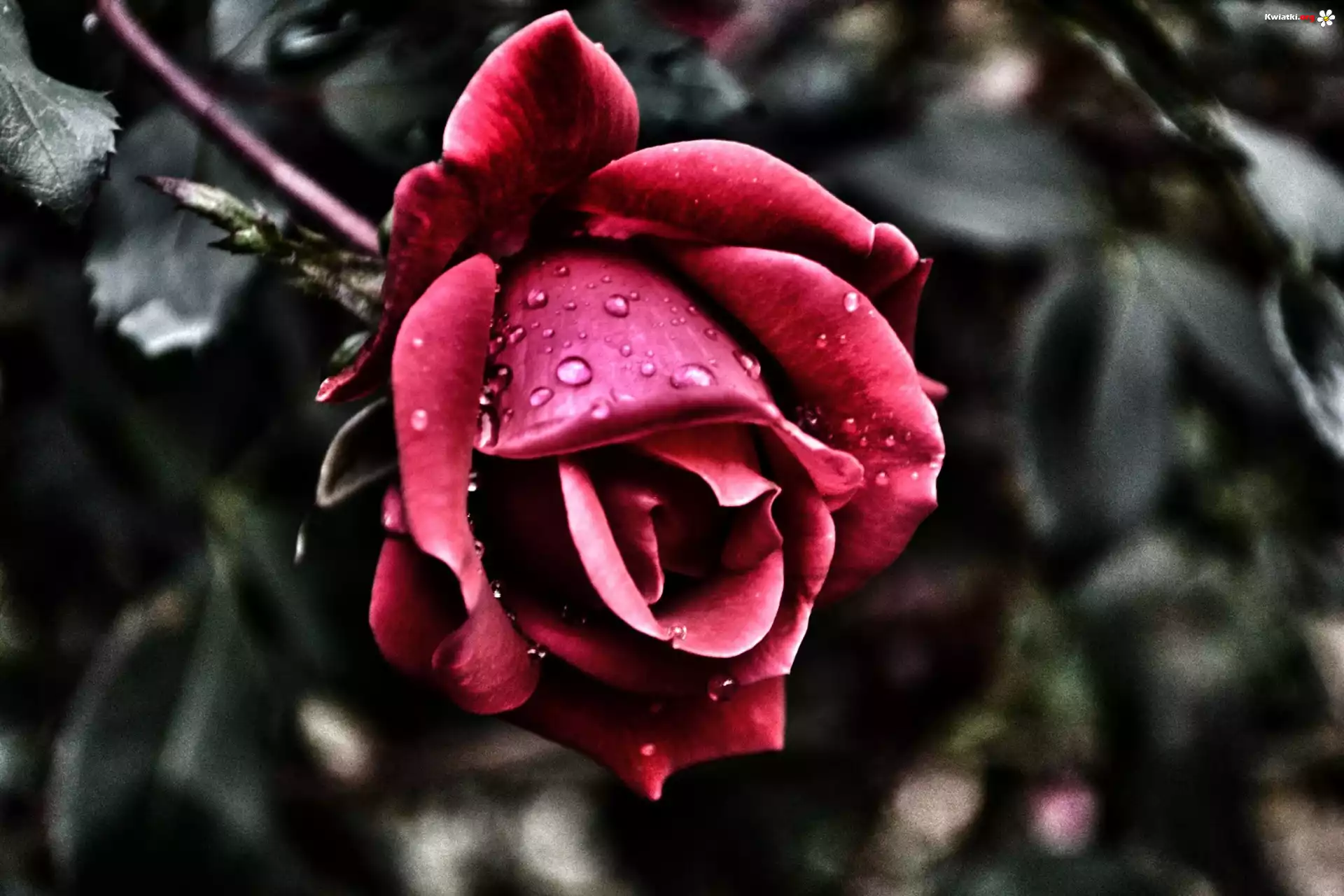 Bordowa, Róża, Krople, Ogród - Zdjęcia