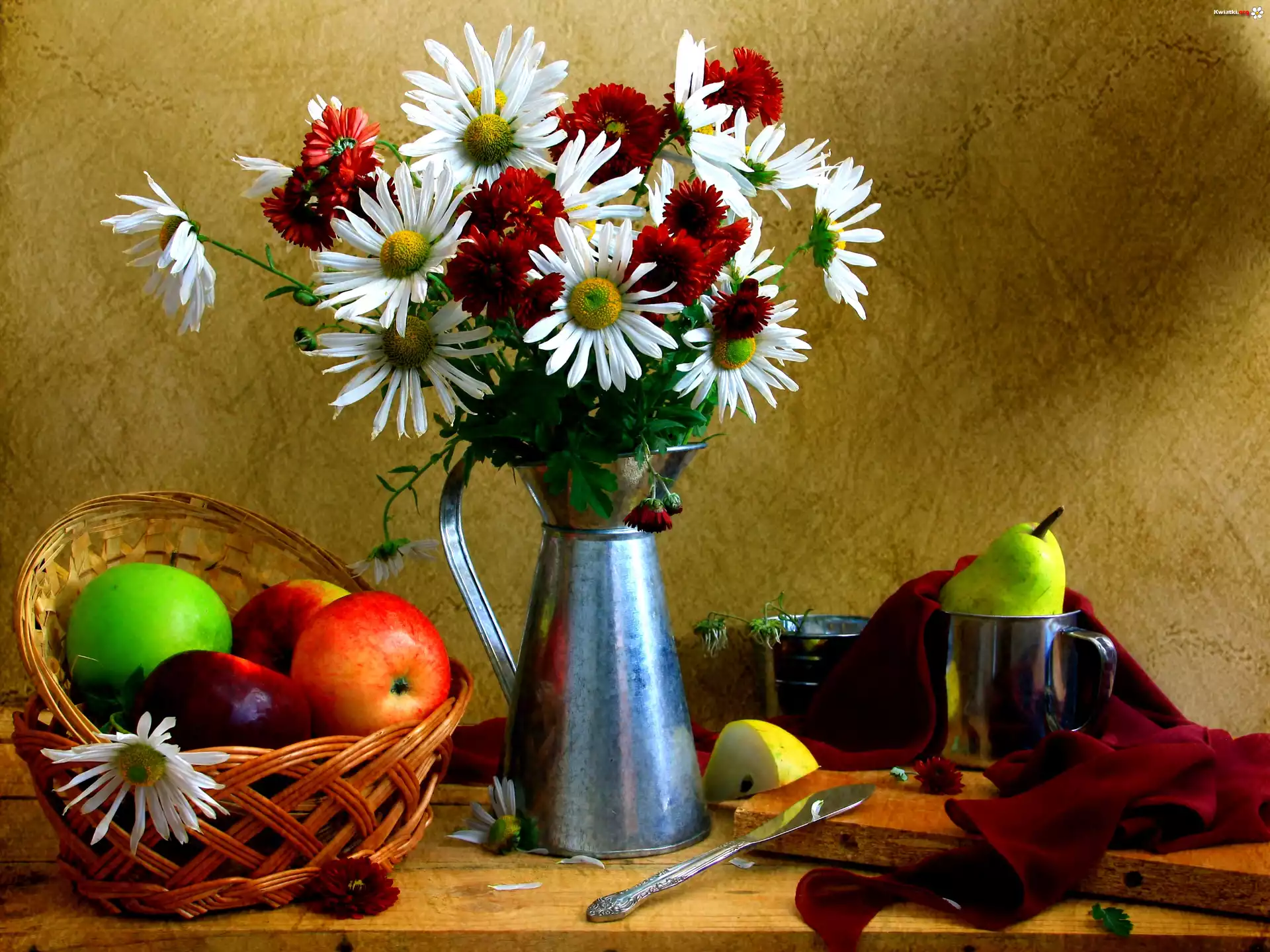 Białe, Bordowe, Margerytki, Blaszane, Naczynia, Koszyk, Owoce - Zdjęcia
