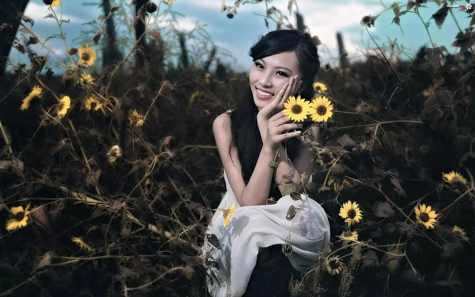 Brunetka, Uśmiech, Pole, Łąka, Kwiaty - Zdjęcia