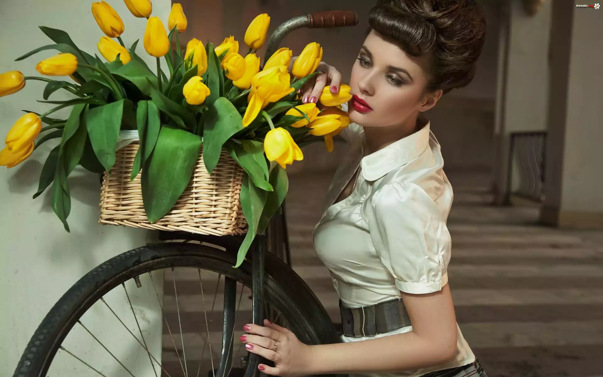 Brunetka, Rower, Koszyk, Bukiet, Tulipany - Zdjęcia