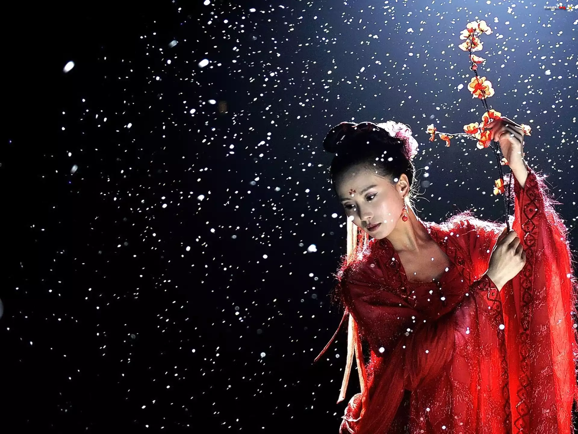 Brunetka, Gałązka, Kwiat, Czerwona, Sukienka - Zdjęcia