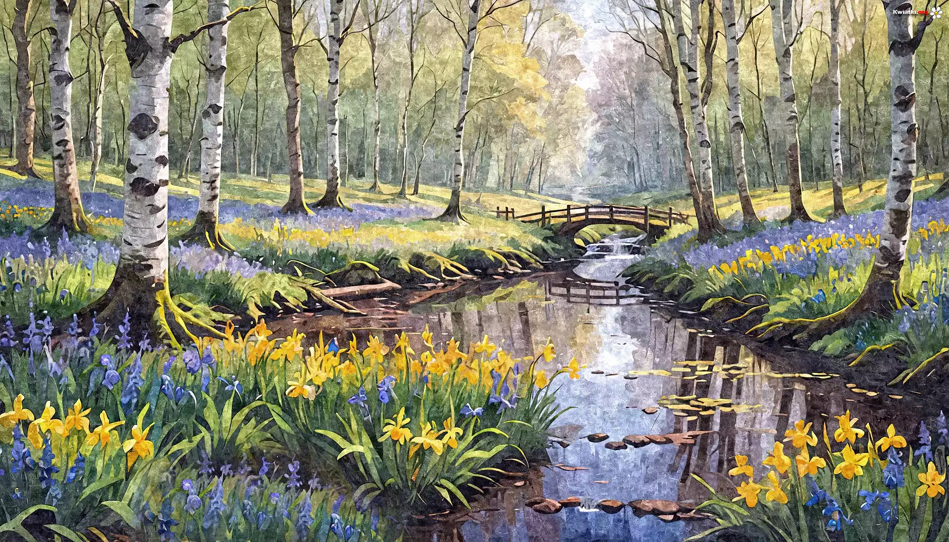 Las, Brzozy, Mostek, Kwiaty, Rzeka - Zdjęcia