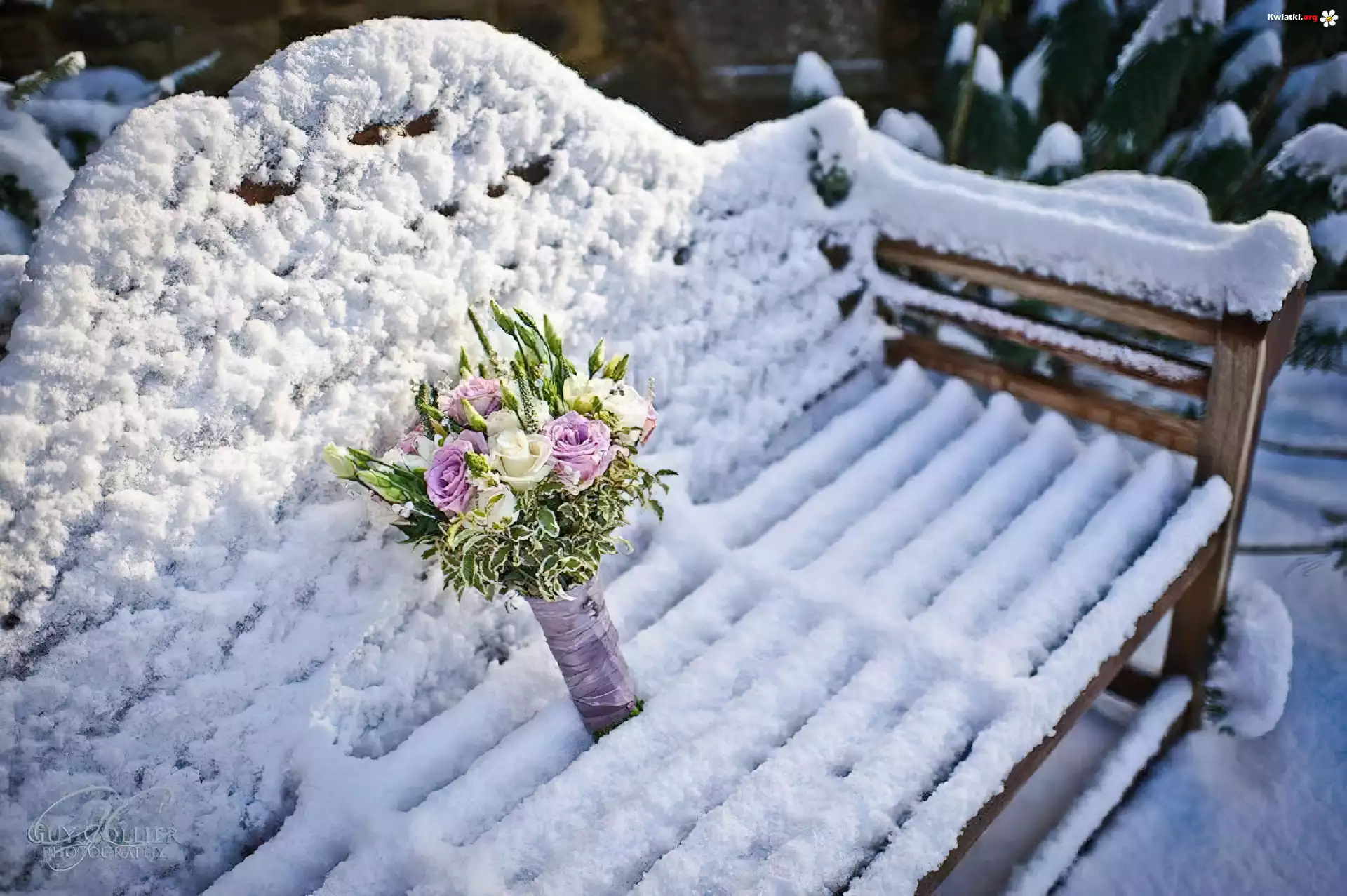 Bukiet, Kwiatów, Ławka, Zima - Zdjęcia