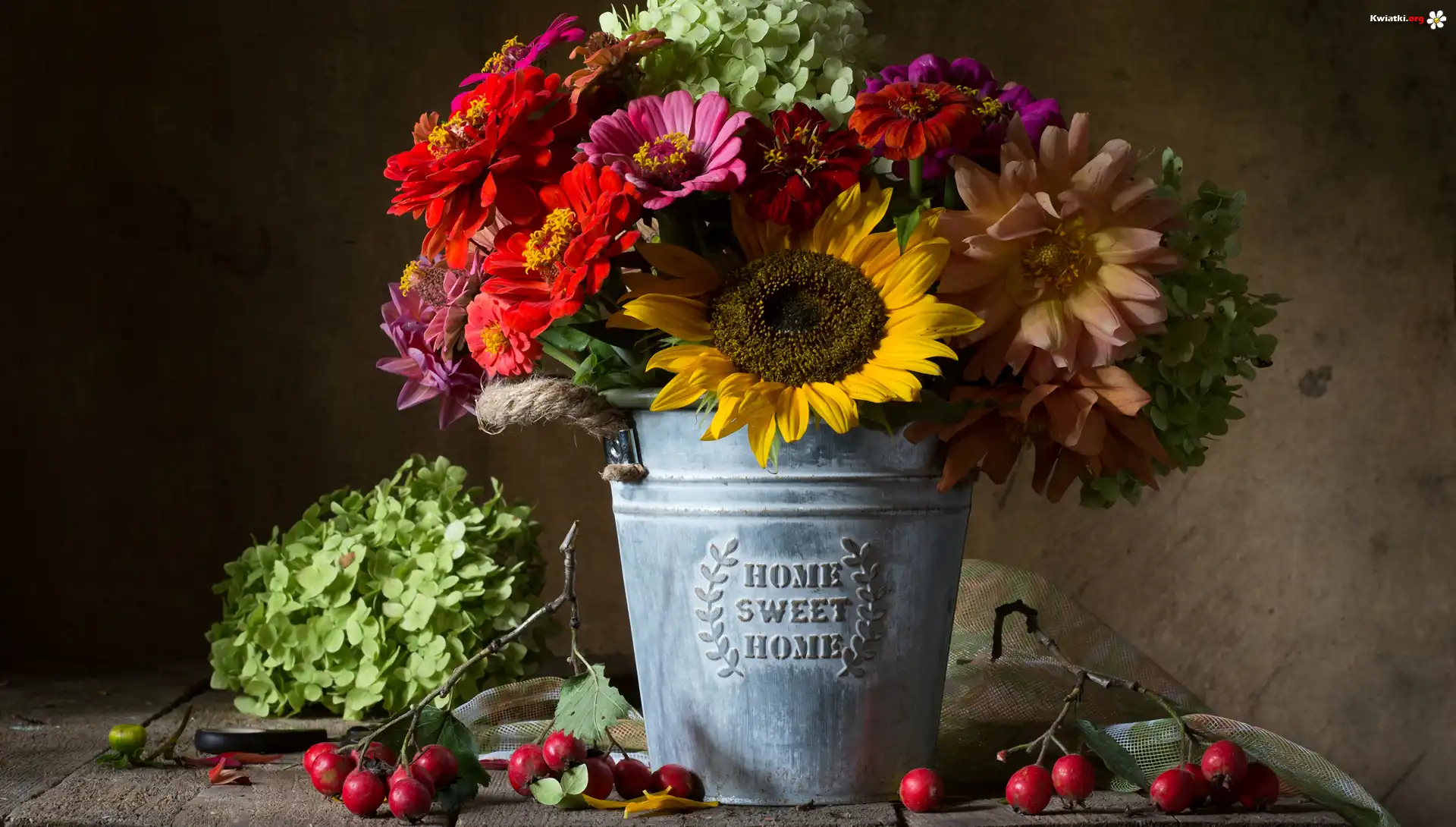 Kwiat Bukiet, Kwiaty, Słonecznik, Cynie, Wiaderko