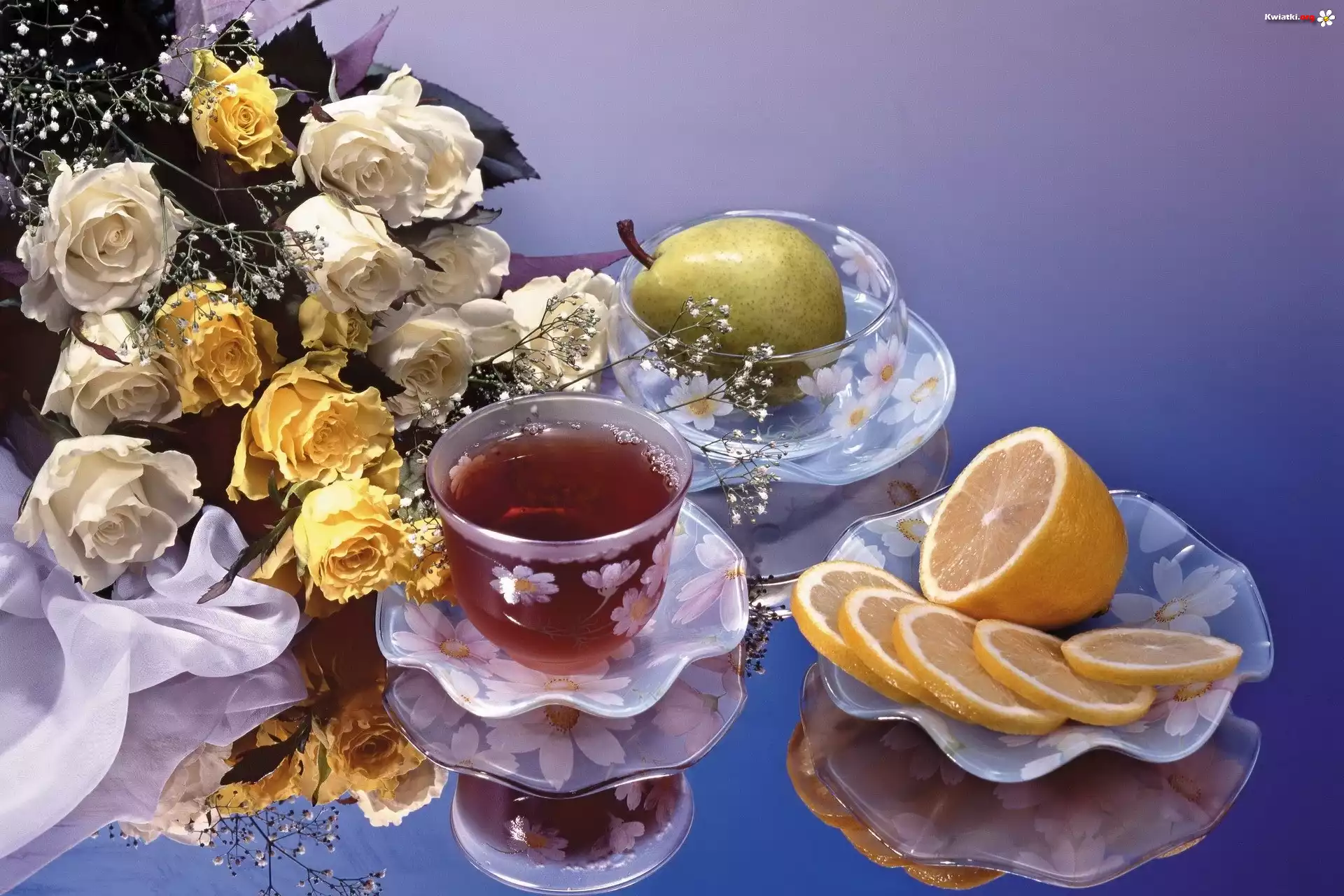 Bukiet, Róż, Herbatka, Cytryna, Gruszka - Zdjęcia