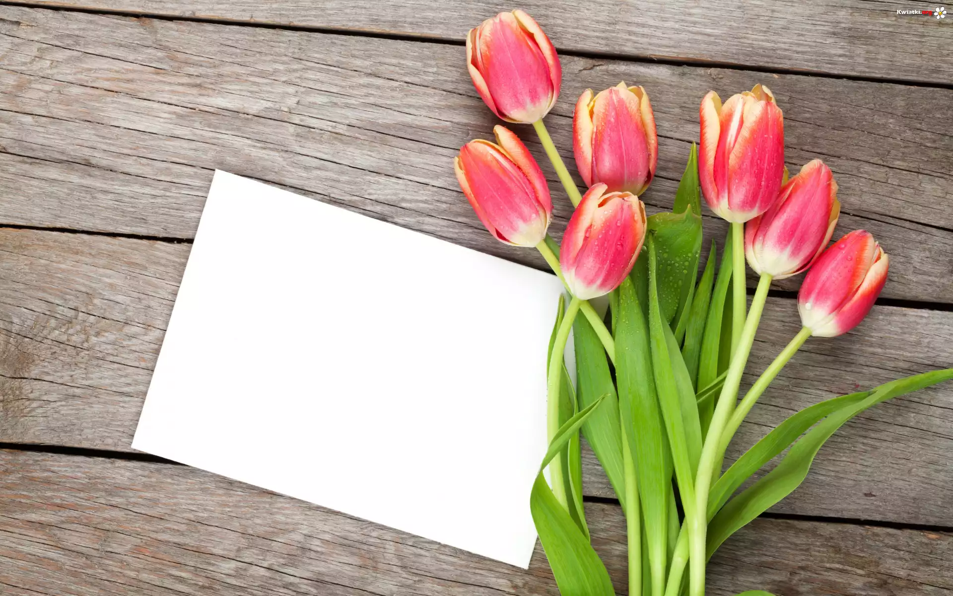 Kwiaty, Bukiet, Czerwono-białe, Tulipany, Liście, Kartka, Deski - Zdjęcia