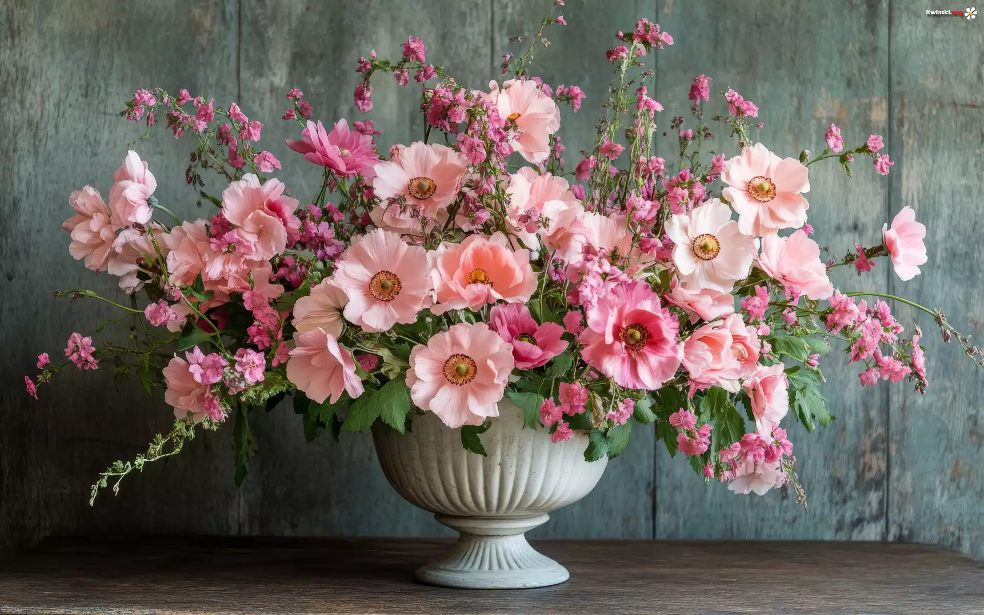 Kwiat Kwiaty, Różowe, Zawilce, Bukiet, Waza, Deski