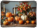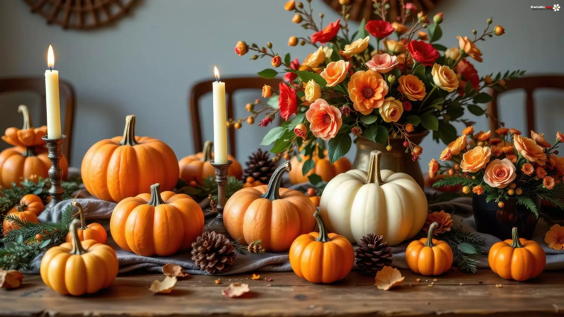 Żółte, Białe, Dynie, Bukiet, Kwiaty, Świece, Szyszki - Zdjęcia