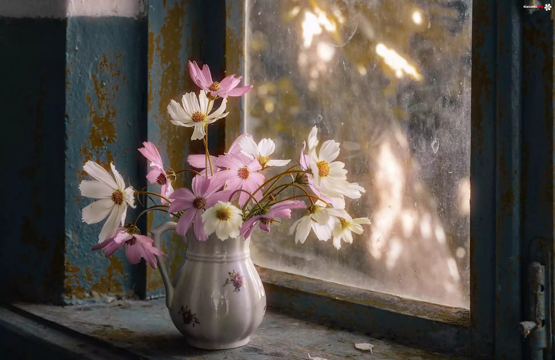 Bukiet, Kwiatów, Kosmea, Dzbanek, Okno - Zdjęcia