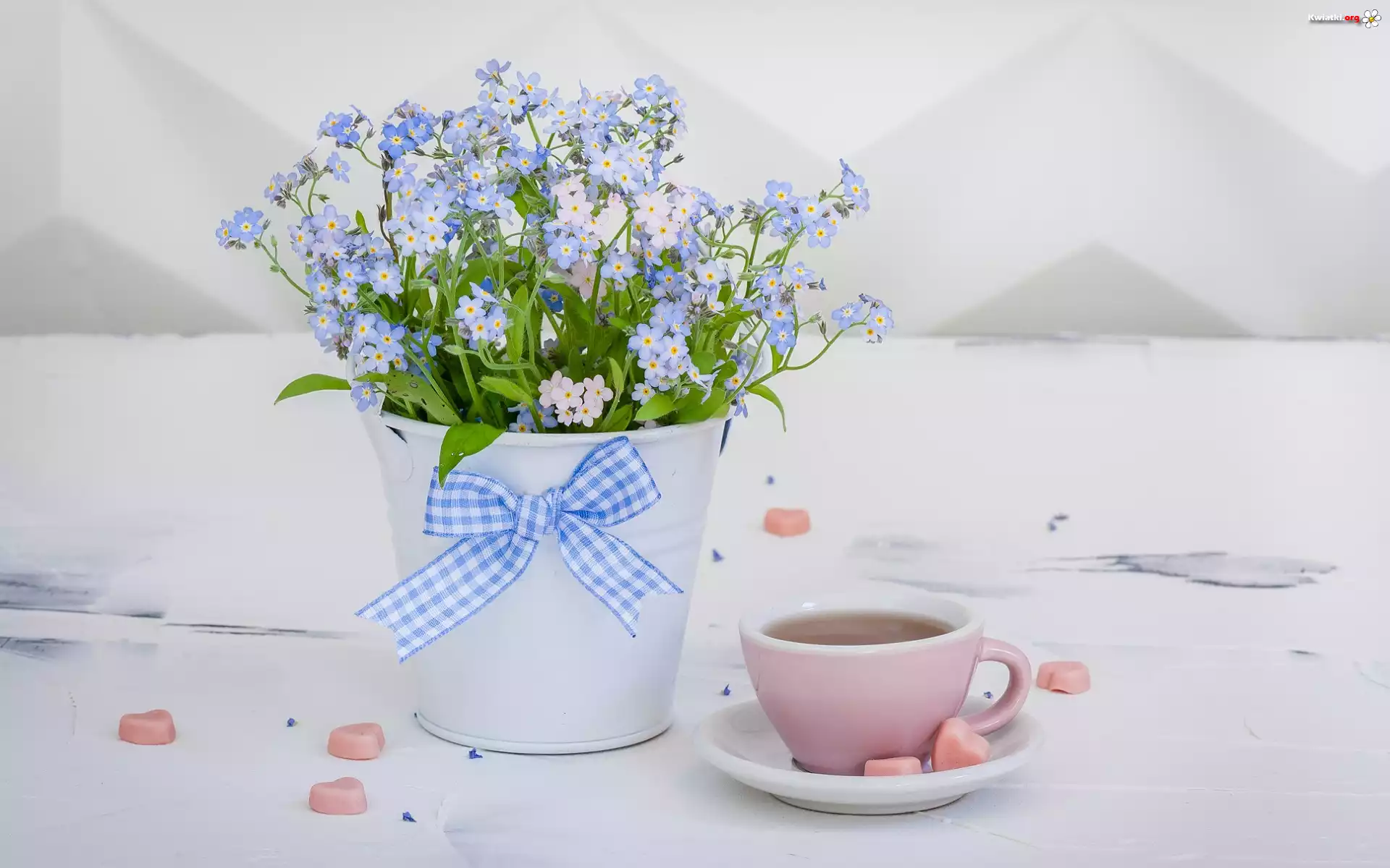 Kwiat Bukiet, Niezapominajki, Doniczka, Filiżanka, Pomadki