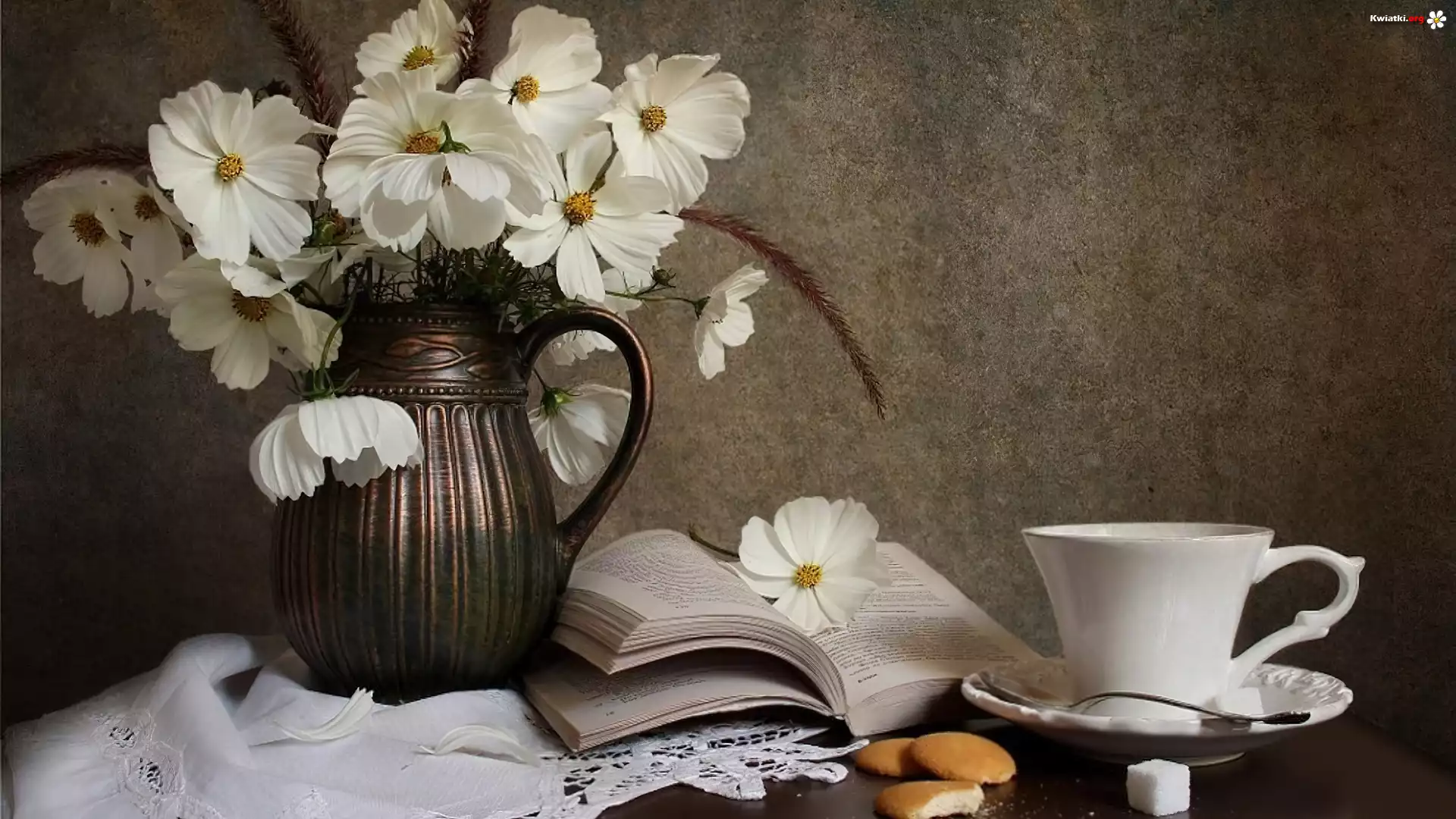 Biała, Kosmea, Flakon, Książka, Filiżanka - Zdjęcia