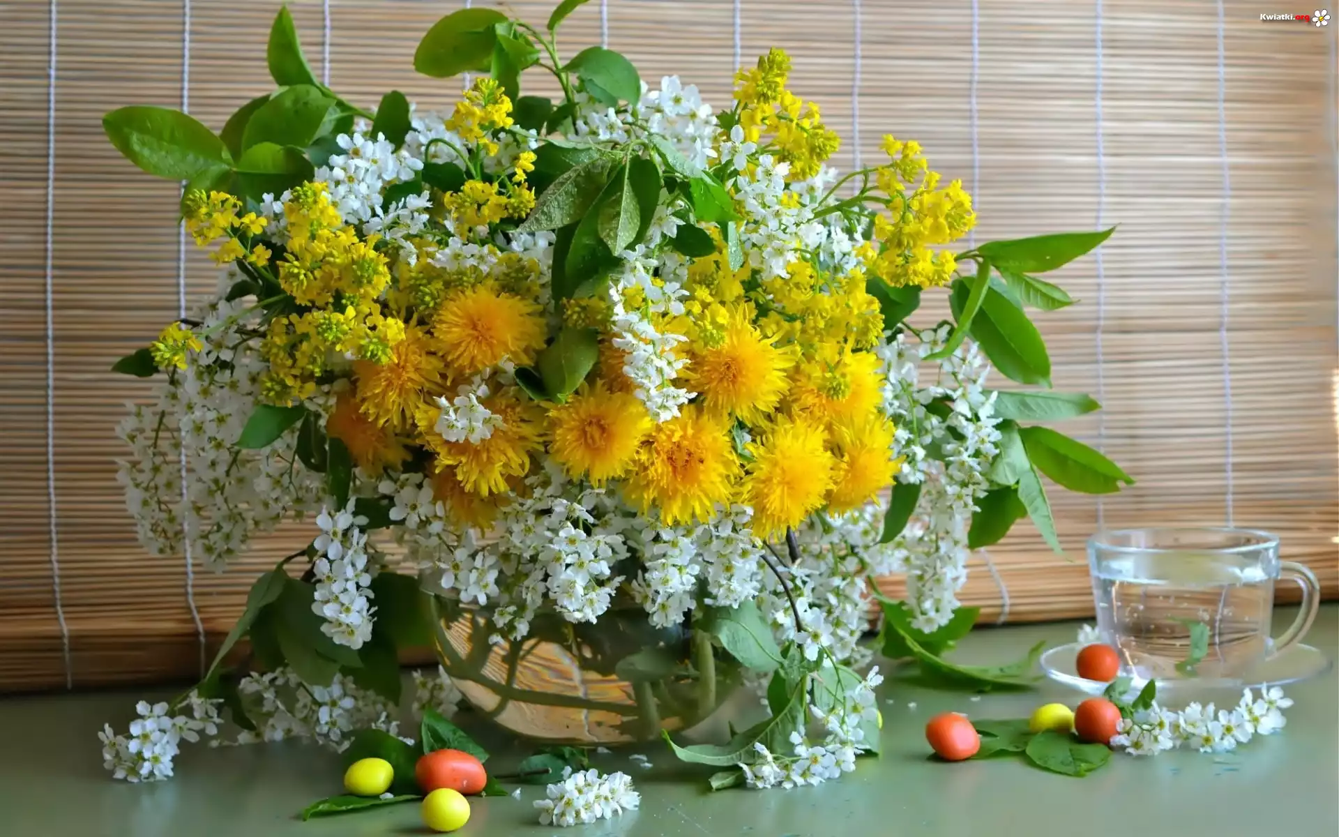 Bukiet, Kwiatów, Mniszek, Wiśnia, Flakon, Filiżanka - Zdjęcia