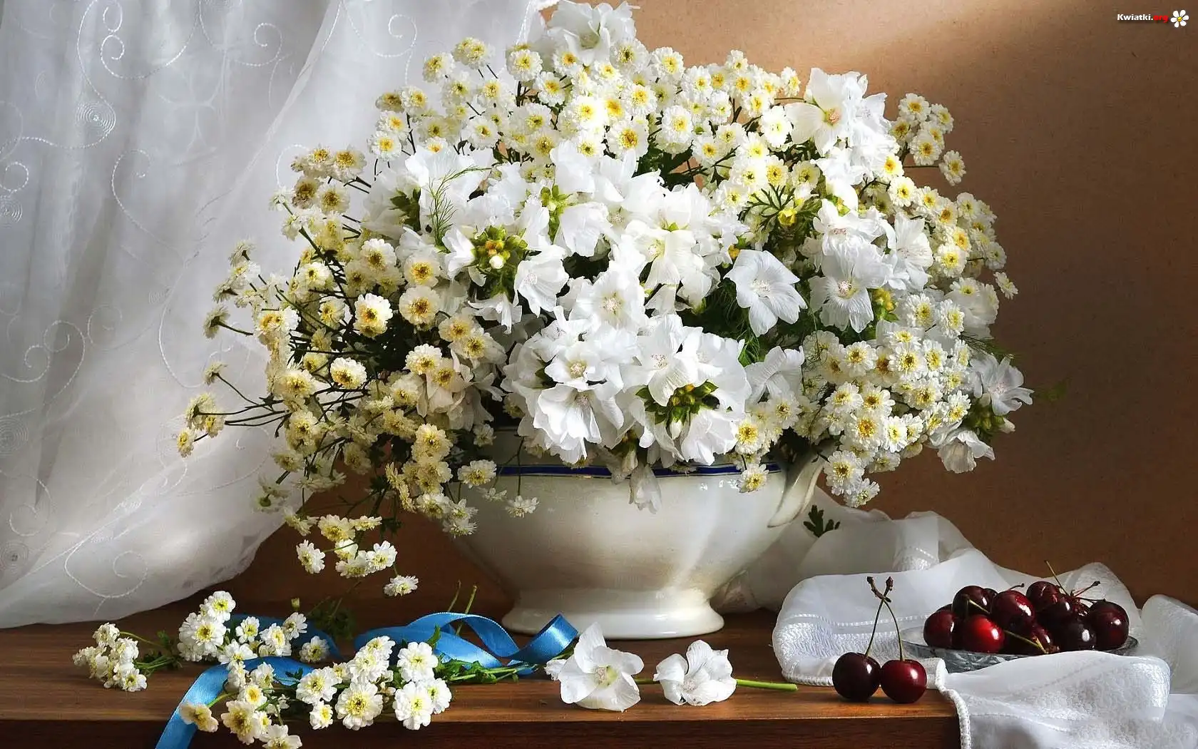 Bukiet, Kwiatów, Gęsiówka, Czereśnie - Zdjęcia