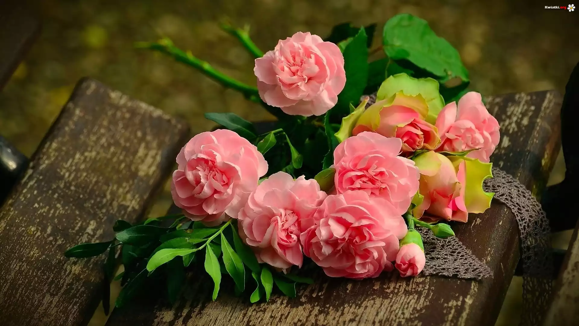 Kwiat Bukiet, Różowych, Róż, Goździki, Ławka