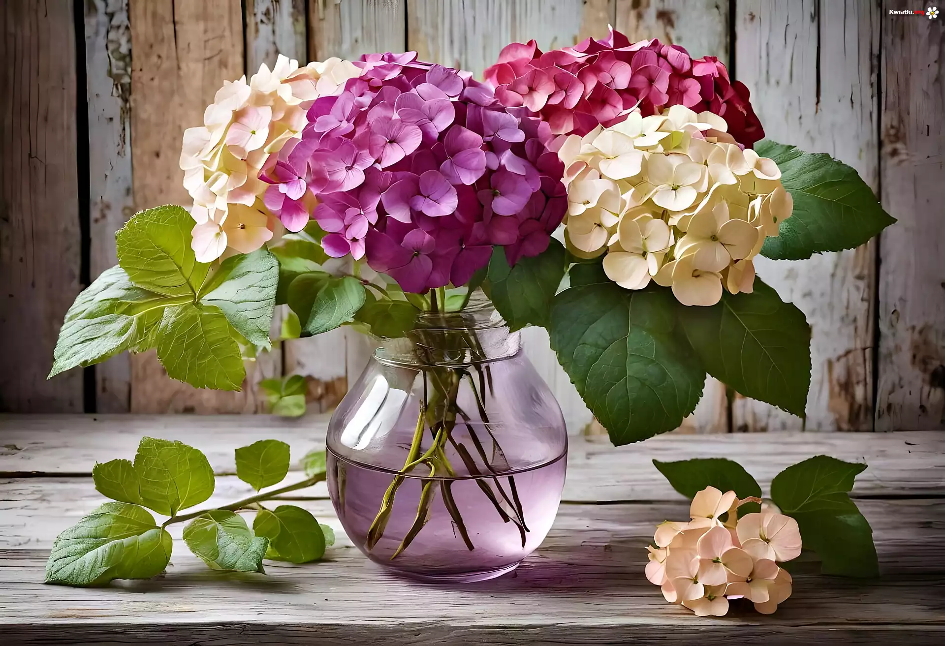 Kolorowe, Kwiaty, Hortensja, Bukiet, Wazon, Deski, Grafika - Zdjęcia