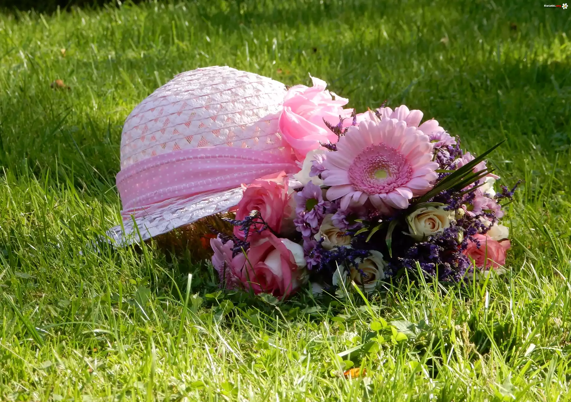 Bukiet, Kwiatów, Kapelusz, Łąka - Zdjęcia