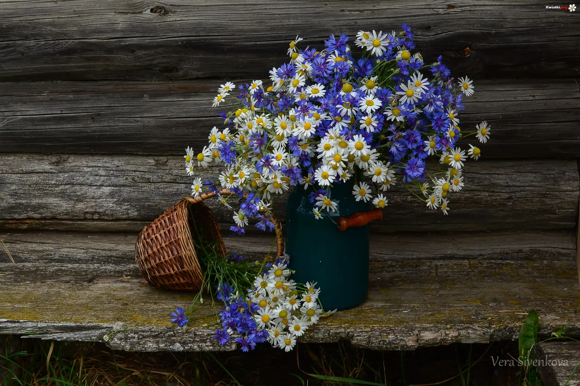 Kompozycja, Bukiet, Kwiaty, Chabry, Rumianki, Koszyk, Bańka - Zdjęcia