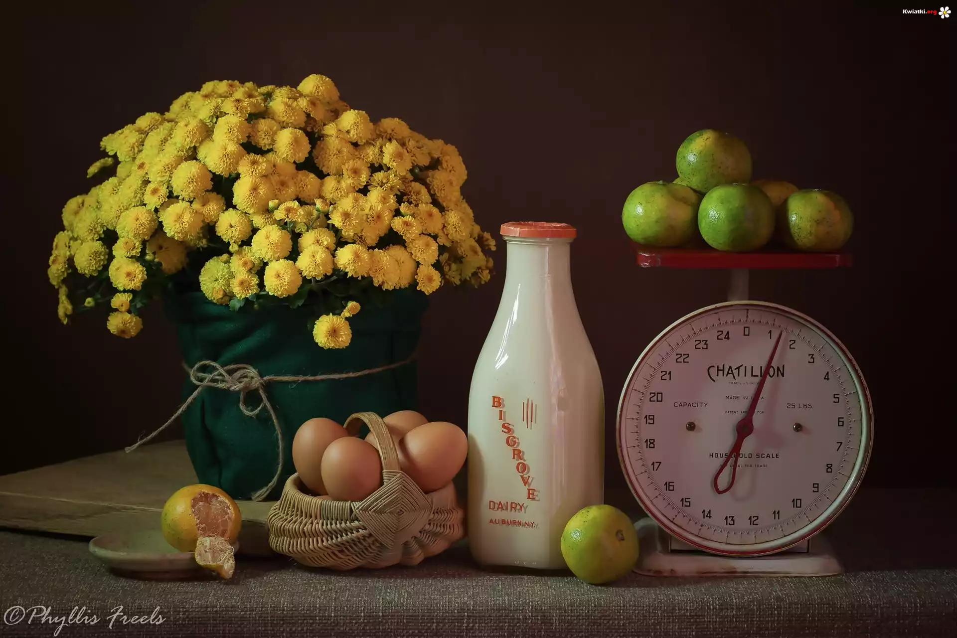 Mleko, Bukiet, Chryzantemy, Waga, Owoce, Jajka, Kompozycja - Zdjęcia