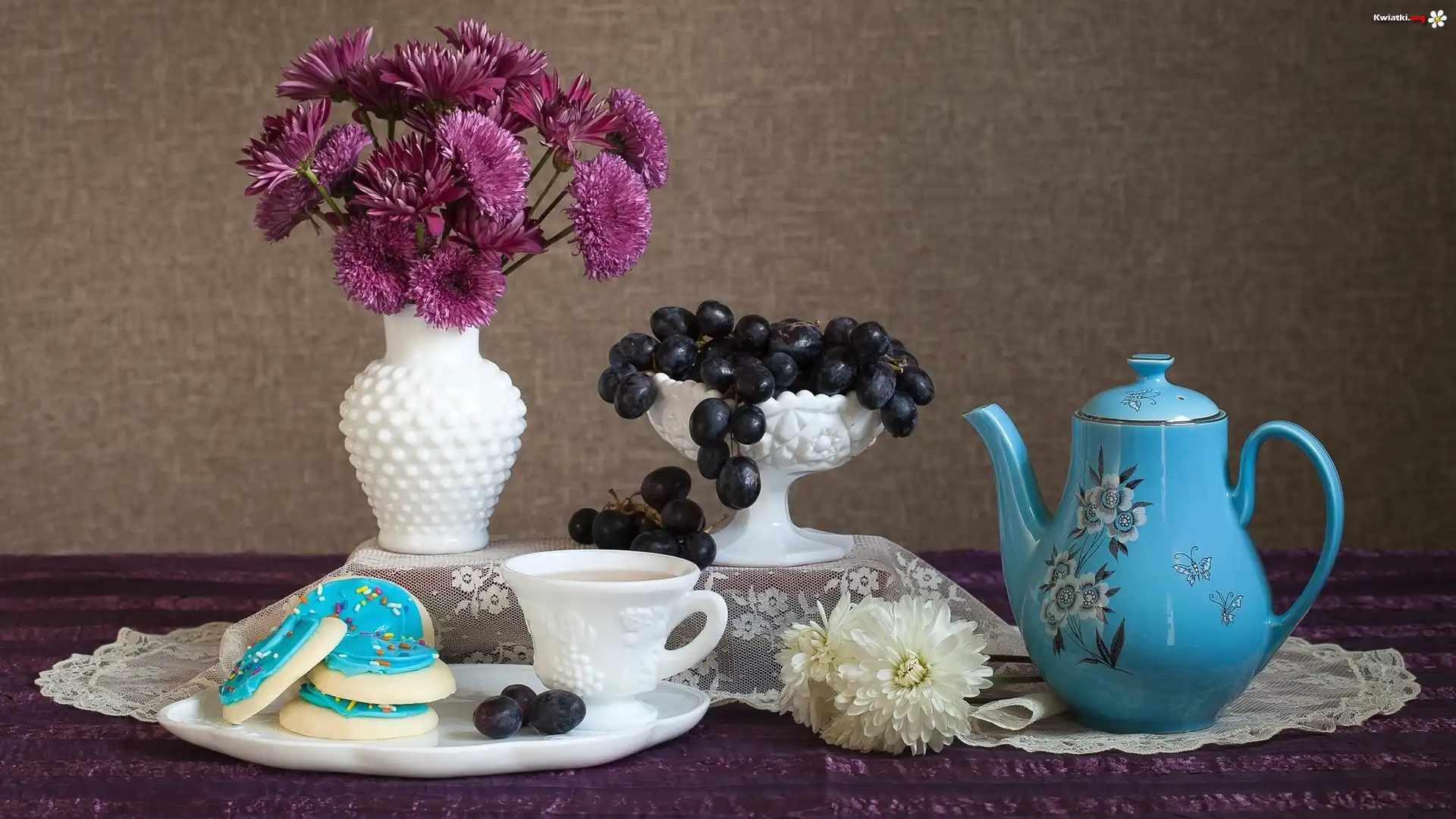 Kompozycja, Bukiet, Astry, Dzbanek, Winogrona, Filiżanka, Ciasteczka - Zdjęcia