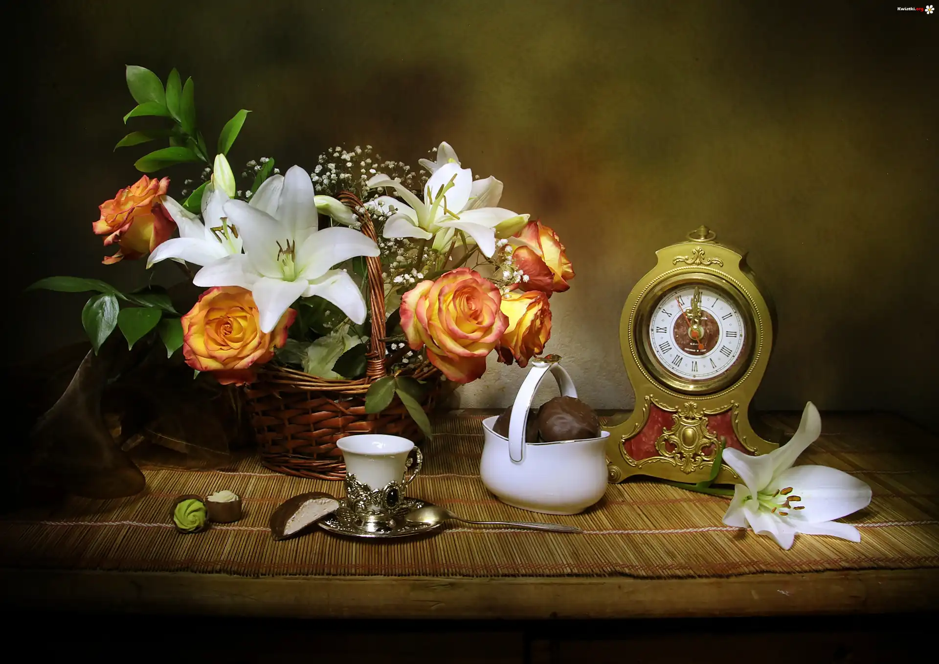 Kompozycja, Bukiet, Róże, Lilie, Kosz, Zegar, Filiżanka - Zdjęcia