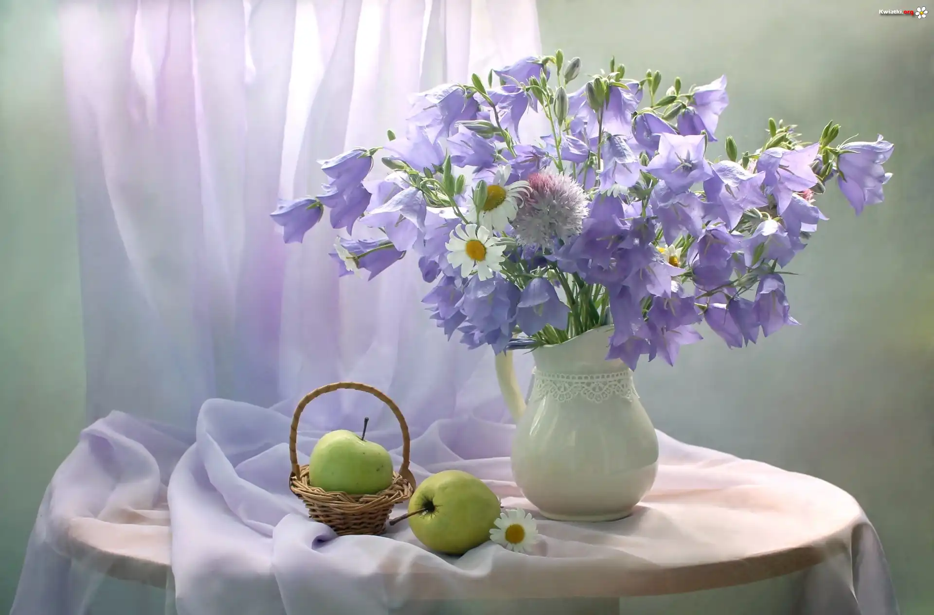 Kompozycja, Bukiet, Margerytki, Dzwonki, Dzbanek, Jabłka, Koszyczek - Zdjęcia