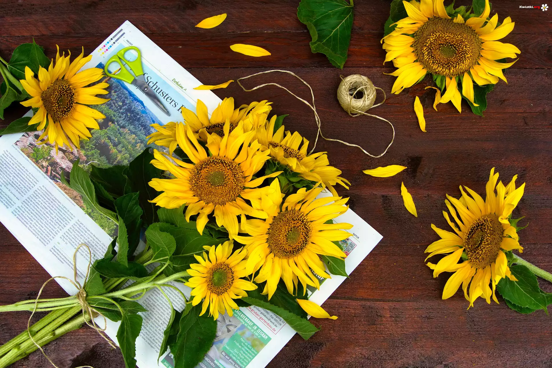 Kwiaty, Bukiet, Słoneczniki, Gazeta, Dekoracja, Sznurek, Nożyczki, Kompozycja - Zdjęcia