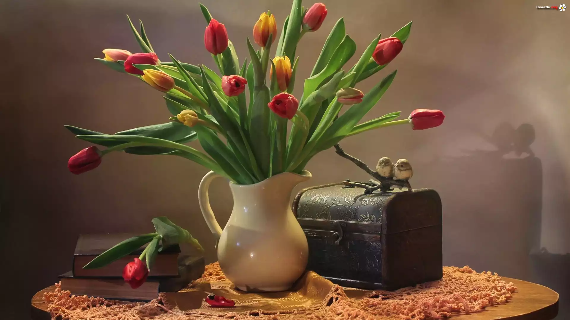 Kompozycja, Bukiet, Tulipany, Dzbanek, Książki, Kuferek, Ptaszki - Zdjęcia