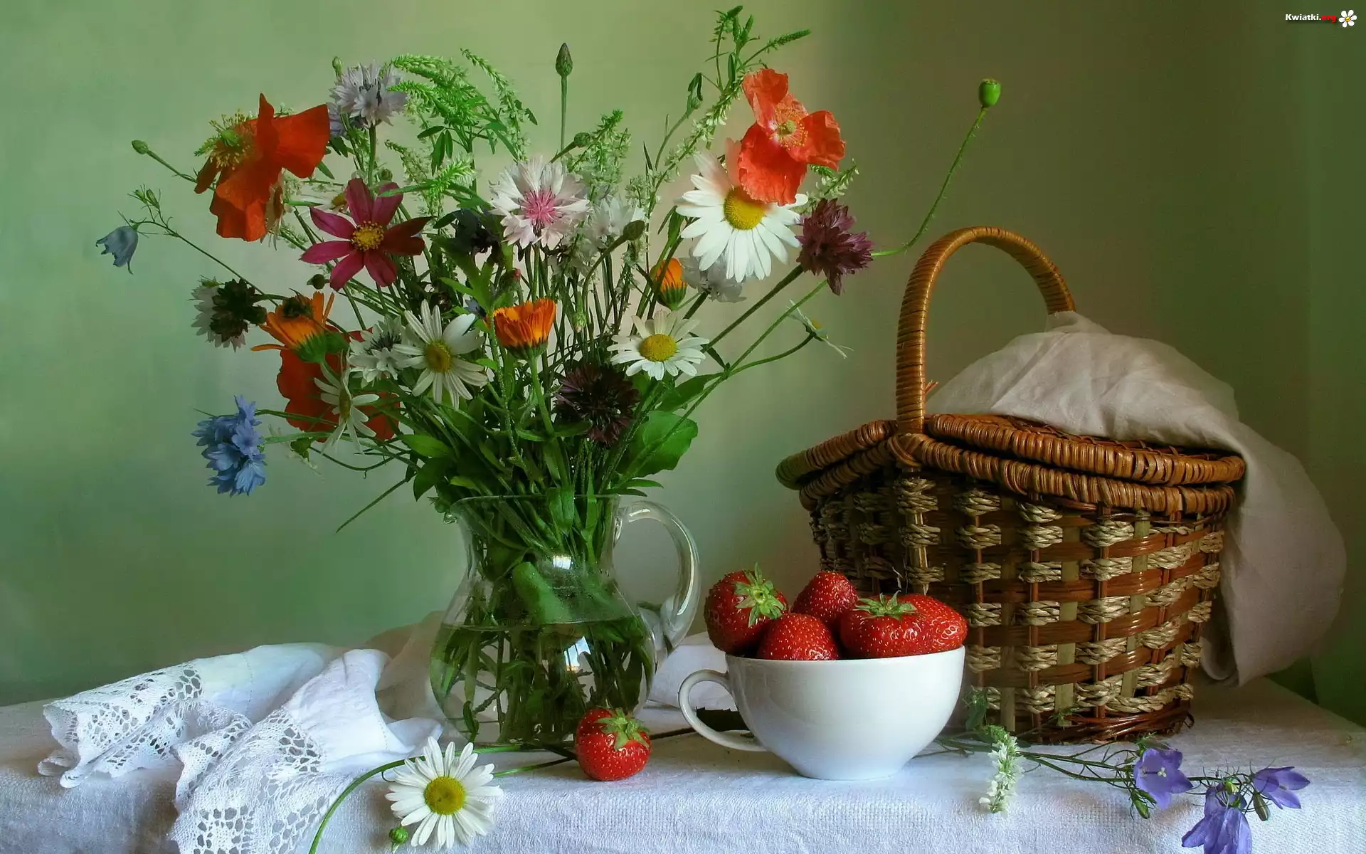 Bukiet, Różnych, Kwiatów, Kosz, Truskawki - Zdjęcia