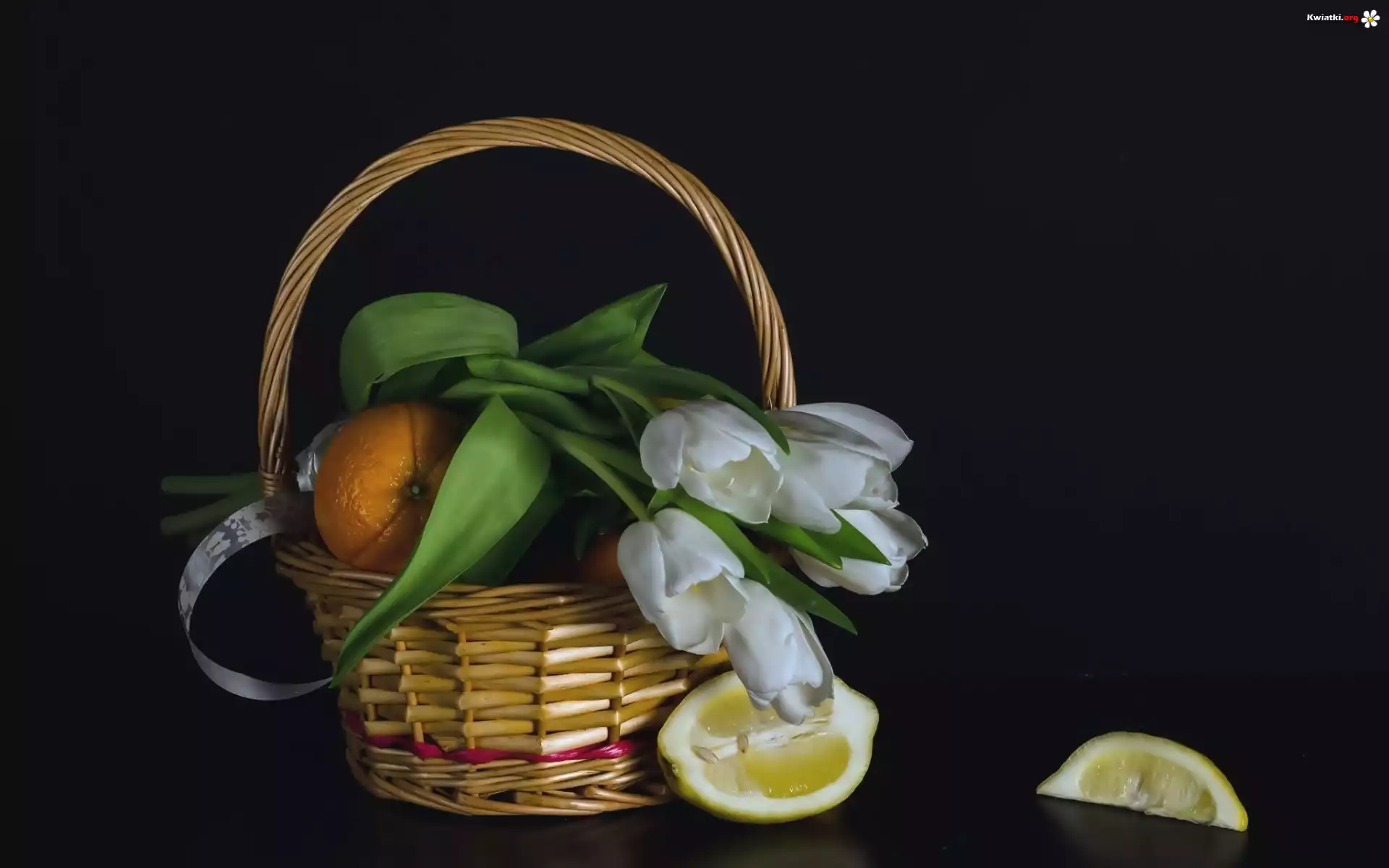 Bukiet, Białych, Tulipanów, Koszyk, Owoce - Zdjęcia