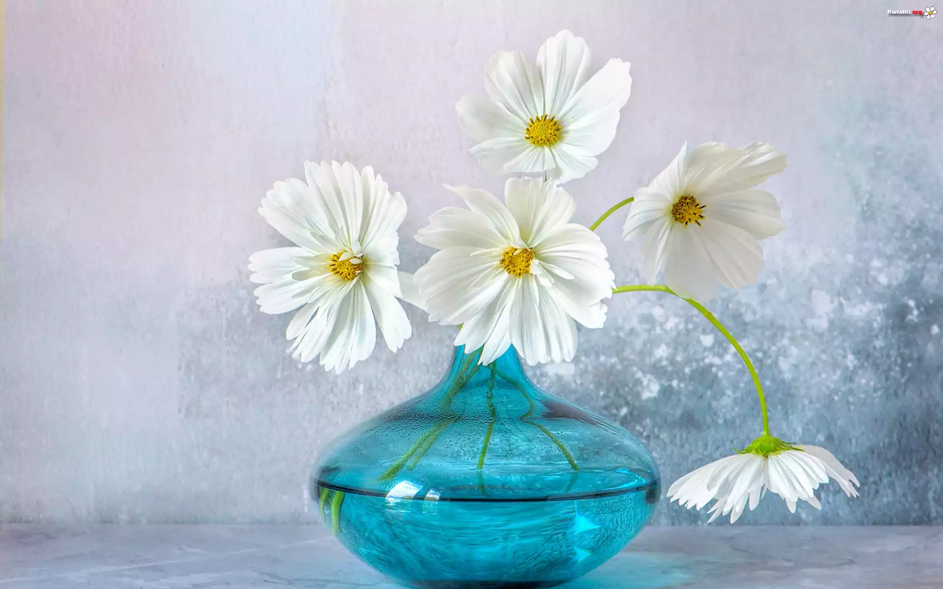 Kwiaty, Bukiet, Białe, Kosmee, Niebieski, Szklany, Wazon - Zdjęcia